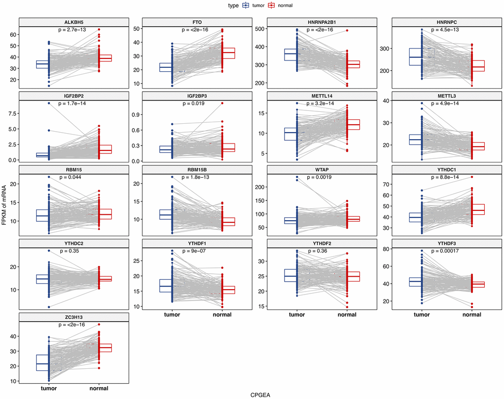 Considering the regulation of m6A methylation was complicated and multidimensional, it is impossible that all m6A methylation regulatory genes presented the same trend in prostate cancer. We discovered that apart from 4 “readers” (YTHDC1, YTHDF2, YTHDF3 and IGF2BP3) whose mRNA expression level were insignificant differences in tumor and normal samples, mRNA expression of two “readers” (IGF2BP2 and METTL14) and two “writers” (VIRMA and ZC3H13) were lower in prostate cancer sites than in normal samples. Moreover, high mRNA expression of WTAP as a “writer” was associated with low GS. This discordance or contradiction illustrated that the biological effects of different m6A methylation regulators on the development and progression of prostate cancer could be different from each other. In this study, we found HNRNPA2B1, METTL3, and RBM15B were overexpressed not only in tumor samples but also in high GS prostate cancer patients. The role of HNRNPA2B1, METTL3, and RBM15B may play an oncogene in prostate cancer. Currently, there were few pieces of research related to HNRNPA2B1 an RBM15B in prostate cancer. Similar to our research, Cai et al. found that METTL3 was overexpressed and promotes tumor proliferation and invasion in prostate cancer [19].