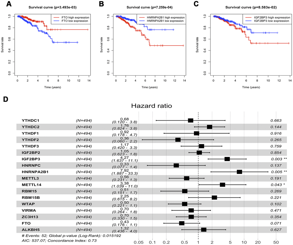 The Kaplan-Meier method with a two-sided log-rank test and univariate and multivariate Cox regression analyses were performed to find the prognostic value of m6A regulators in expression and gene-level alteration. All statistical analyses and data visualizations were based on R v3.6 (https://www.r-project.org).
