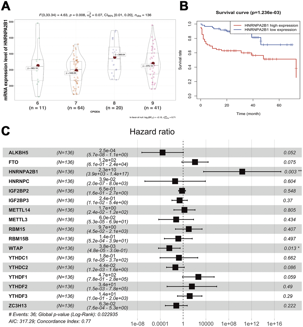 To investigate the effects of m6A regulatory genes expression on prostate cancer recurrence-free survival (RFS), we implemented the Kaplan-Meir method and cox regression analyses. In univariate Kaplan-Meir analyses, high expression of HNRNPA2B1 and low expression level of FTO had poorer RFS of prostate cancer (Figure 4A, 4B). Similarly, IGF2BP3 (p < 0.05), HNRNPA2B1 (p < 0.05) and WTAP (p < 0.05) were significantly related to prostate cancer RFS (Figure 4C and Supplementary Table 1) in univariate cox regression analyses. Furthermore, multivariable Cox regression survival analysis shown that IGF2BP3 (HR = 4.27, 95%Confidence index (CI)1.637-11.1), HNRNPA2B1 (HR = 7.92, 95%CI 1.887-33.3), and METTL14 (HR = 3.38, 95%CI 1.039-11.0) were statistically meaningful risk factors of RFS in prostate cancer (Figure 4D). To validate the above results, we implement survival analyses of m6A methylation regulators expression in Chinese Prostate Cancer Genome and Epigenome Atlas (CPGEA) dataset. Consistent with results based on prostate cancer patients from TCGA, we also found that HNRNPA2B1 was not only highly expressed in patients with high GS (Figure 5A), but also significantly associated with unfavorable RFS (HR = 2.3e+10, 95%CI 3.9e+3 - 1.4e+17) (Figure 5B, 5C).