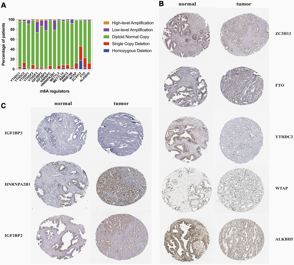 Among a total number of 492 cases with CNVs data in the TCGA prostate cancer dataset, about 70.2% (1213/1728) m6A methylation regulatory genes CNVs events we found were loss of DNA copy number (Supplementary Table 2 and Figure 6A). The percentage of copy number loss of ZC3H13 (46.1%) was the highest in all the m6A methylation regulators CNV loss, followed by CNV deletion percentage of FTO and YTHDC2 (Figure 6A). While the copy number gain of YTHDF3, IGF2BP3 and HNRNPA2B1 were the top 3 most frequent in all m6A regulatory genes amplification. We screened the protein level of most frequent m6A regulators in all copy number changes. We found that the copy number loss of ZC3H13, FTO, YTHDC2, WTAP and ALKBH5 decreased the protein expression in tumor samples, and meanwhile, patients with amplification of IGF2BP3, HNRNPA2B1 and IGF2BP2 presented higher expression level of these three proteins than normal tissues (Figure 6B, 6C).