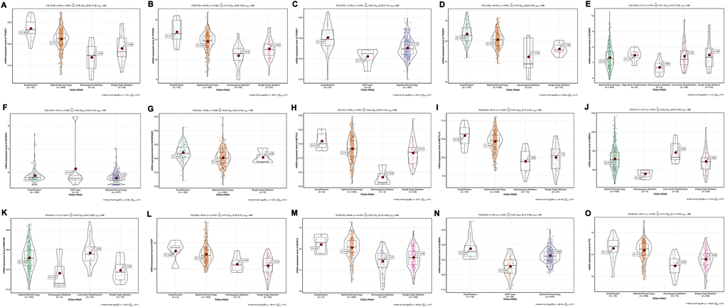 To investigate the effects of CNV of 6A methylation regulatory genes on mRNA expression, we evaluated the mRNA expression in different CNV status. As suspected, the results have shown that gene-level amplification despite low-level or high-level was significantly associated with higher mRNA expression, while lower expression resulted from CNV loss including homozygous deletion and single-copy deletion (Figure 7). There were only YTHDF3 and HNRNPC expression did not relate to its copy number changes (Supplementary Figure 4).