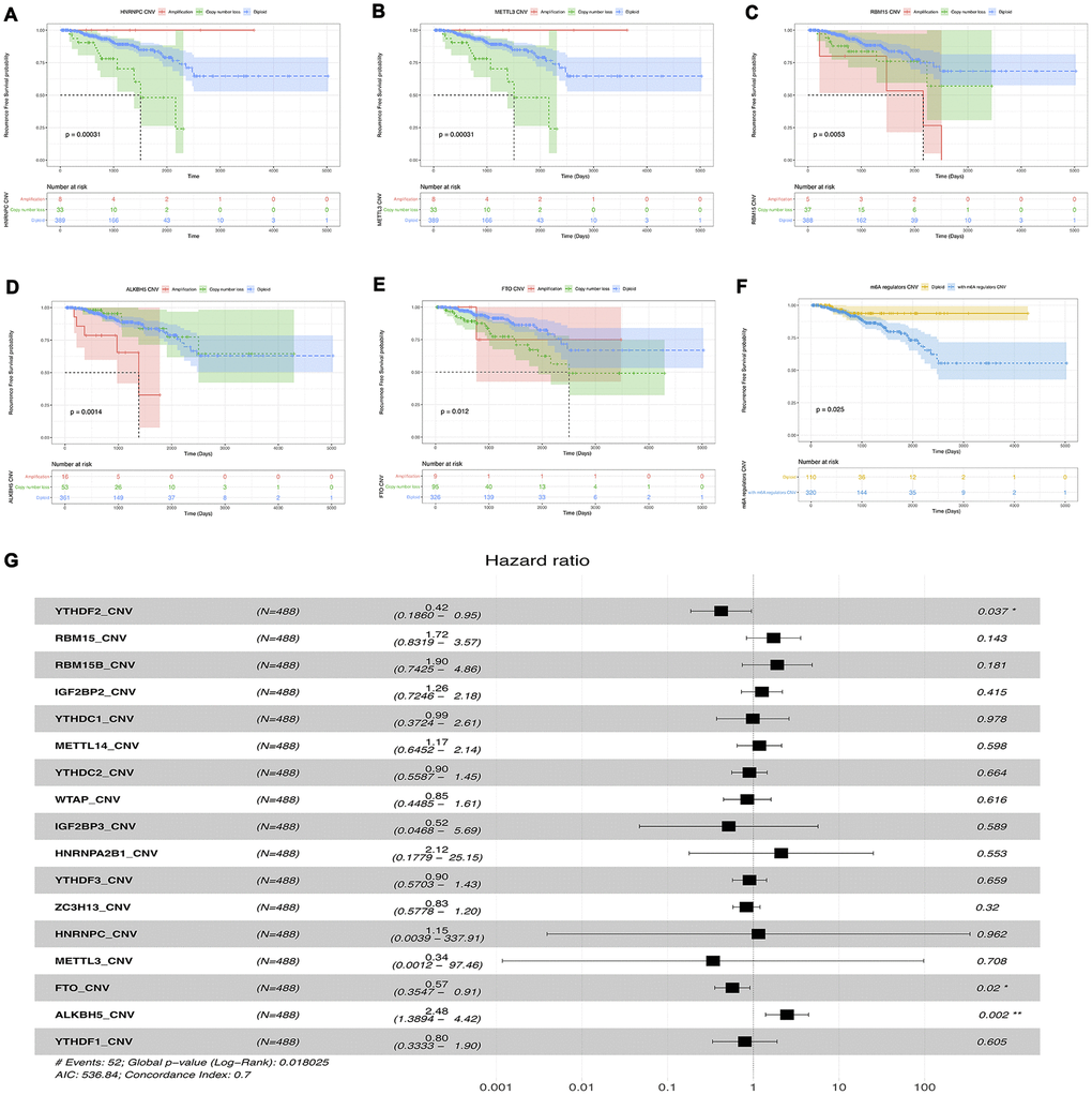 First, univariable survival analyses were performed to examining the prognostic value of CNVs of m6A methylation regulatory genes. We found that the CNVs patterns of HNRNPC, METTL3, RBM15, ALKBH5 and FTO (one reader, two writers, and two erasers) were notably associated with RFS of prostate cancer. Specifically, copy number loss of HNRNPC, METTL3, and FTO were significantly correlated with poor survival of prostate cancer, while patients with copy number gain of RBM15 and ALKBH5 had worse RFS (Figure 8A–8F). Then, multivariable cox survival analyses were implemented to acquire more accurate information about the effects of CNVs on the prognosis of prostate cancer,. The result has shown that gene-level deletion of YTHDF3 (HR 0.42, 95% CI 0.19-0.95), FTO (HR 0.57 95% CI 0.35-0.9) and amplification of ALKBH5 (HR 2.48 95% CI 1.39-2.42) were risk factors of prostate cancer biochemical recurrence (Figure 8G).