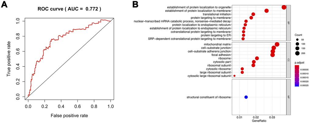 We compared the effects of mRNA expression and CNVs or mutation of m6A methylation regulators on tumor stage and prognosis of prostate cancer. We found that mRNA expression could be more valuable than gene-level alteration (Supplementary Figure 6). Furthermore, the area under receivers (AUC) of the multivariable Cox survival regression based on m6A regulators expression reached 0.772 (Figure 9A). Therefore, we classified the prostate cancer patients into high m6A risk groups and low m6A risk groups according to multivariable cox regression. Then, gene ontology analysis was performed between two groups. The results presented that protein location was significantly associated with m6A methylation regulation (Figure 9B).