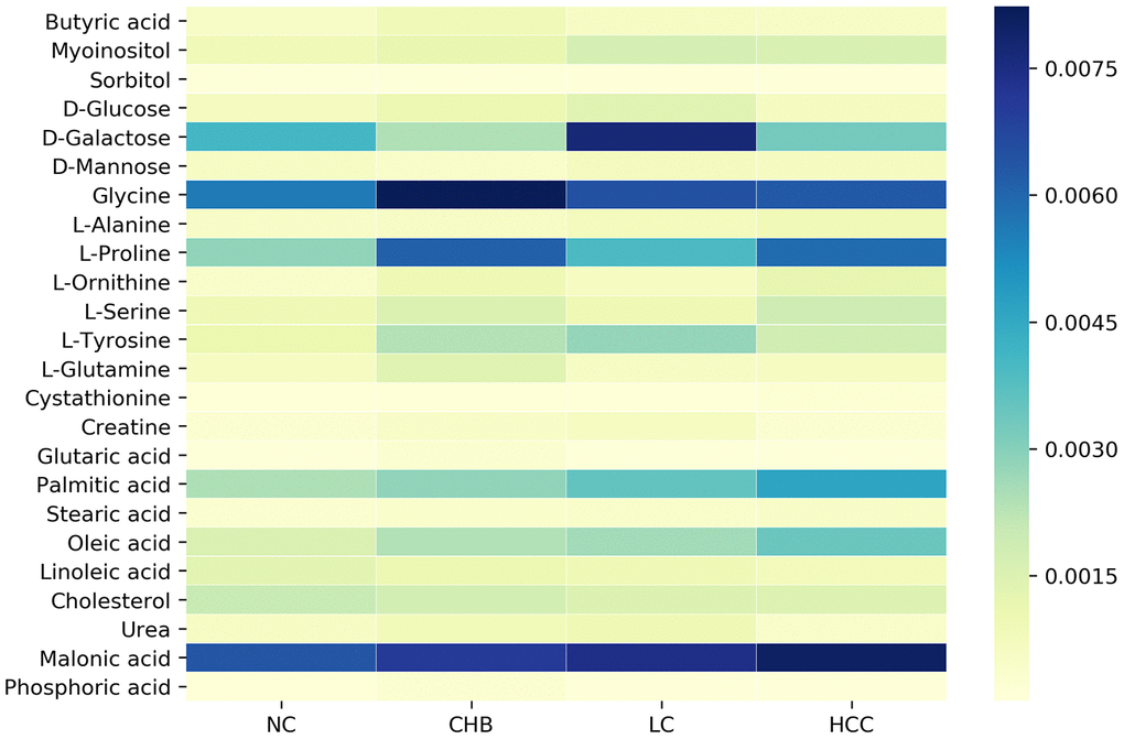 To identify the DMs in the NC, CHB, LC and HCC groups, OPLS analysis was performed, and 24 DMs were screened from the NC group and three disease groups by VIP > 1 and P < 0.05. We found that the expression levels of various metabolites changed significantly, especially carbohydrates, including glucose, galactose, and mannose, amino acids, including glycine, alanine, proline, and tyrosine, and lipids, including various fatty acids and cholesterol. The dynamic changes of these metabolites in HBV infection disease development are visually shown in Figure 2. These metabolites may be characteristic of the progression of CHB to HCC, including 20, 16, 13, and 16 DMs between NC and CHB, CHB and LC, LC and HCC, HCC and NC, respectively (Supplementary Table 1).