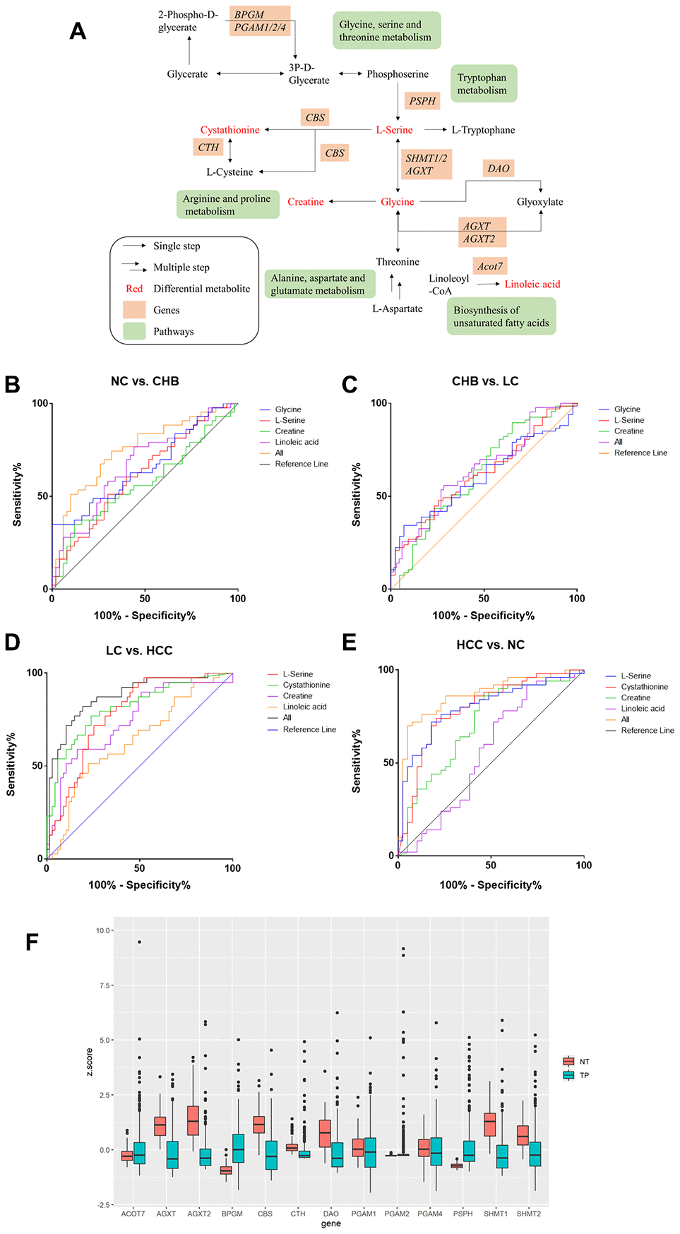 In conclusion, our study suggests that the expressions of plasma L-serine, cystathionine, creatine and glycine were upregulated while linoleic acid was downregulated from CHB, LC to HCC, and the panels of multiple DMs may be helpful to distinguish NC from CHB, CHB from LC, and LC from HCC, respectively. Moreover, the lower expression of AGXT2, DAO and CTH and the higher expression of BPGM, CBS, PSPH and ACOT7 were associated with poor prognosis for HCC.