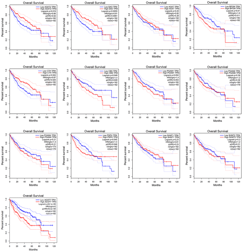 Kaplan–Meier survival analysis of data from GEPIA revealed that HCC patients with high expression (n = 182) of AGXT2 (HR = 0.66, P = 0.019), DAO (HR = 0.61, P = 0.005), and CTH (HR = 0.67, P = 0.024) had a better prognosis than patients with low expression (n = 182) of AGXT2, DAO, and CTH, while HCC patients with low BPGM (HR = 1.6, P = 0.010), CBS (HR = 1.4, P = 0.049), PSPH (HR = 1.4, P = 0.045), and ACOT7 (HR = 2, P < 0.001) were associated with a longer OS rate (Figure 5). However, AGXT, PGAM1, PGAM2, PGAM4, SHMT1, and SHMT2 mRNA expression did not significantly correlate with the OS of HCC patients.