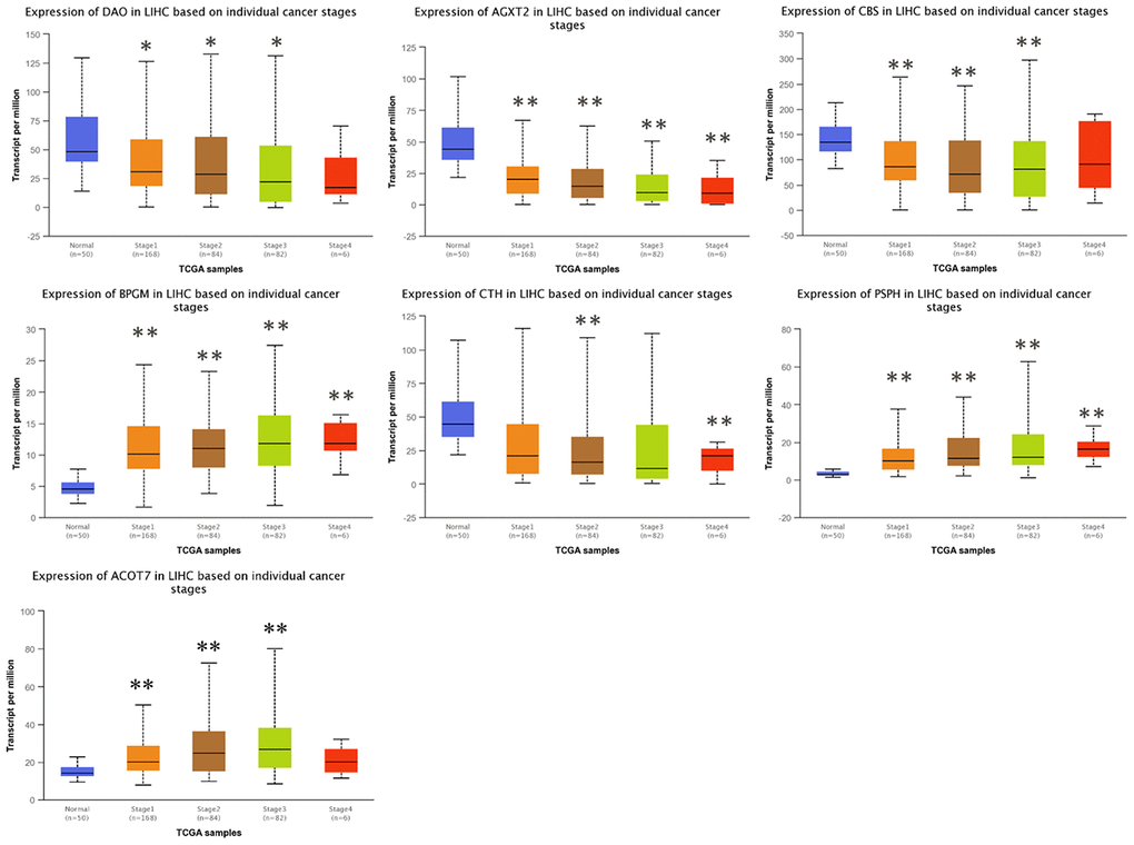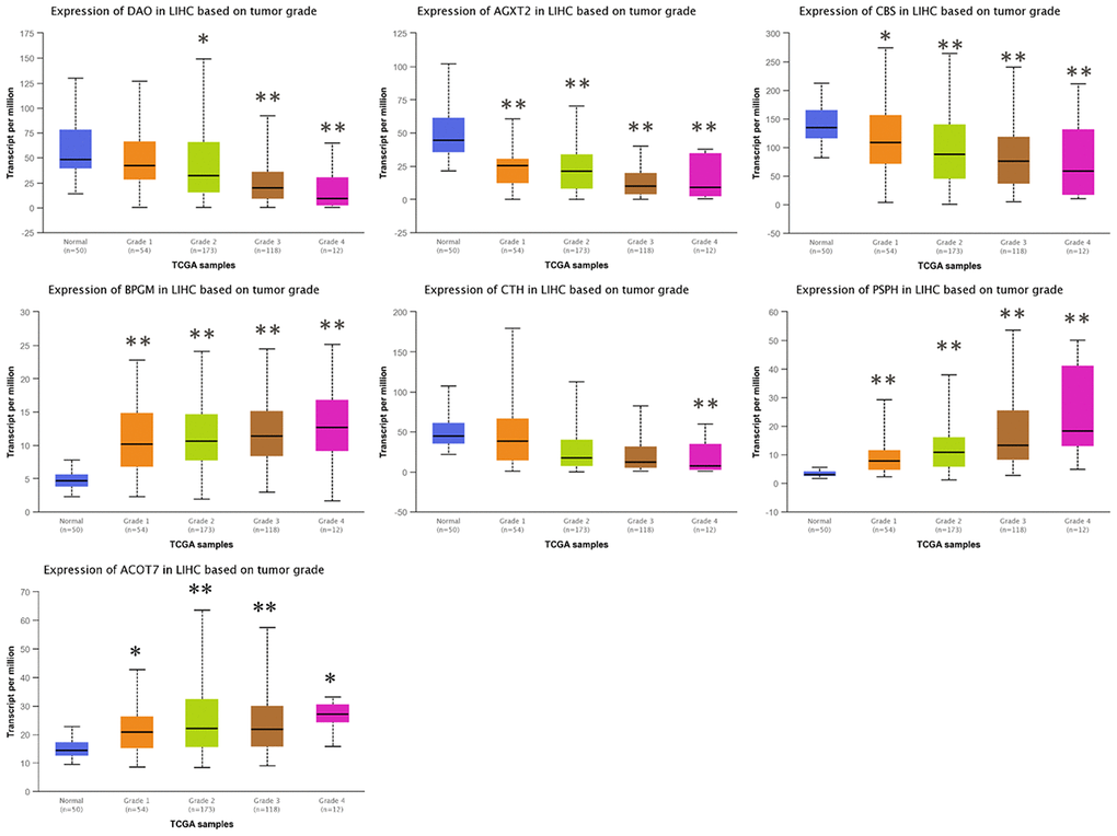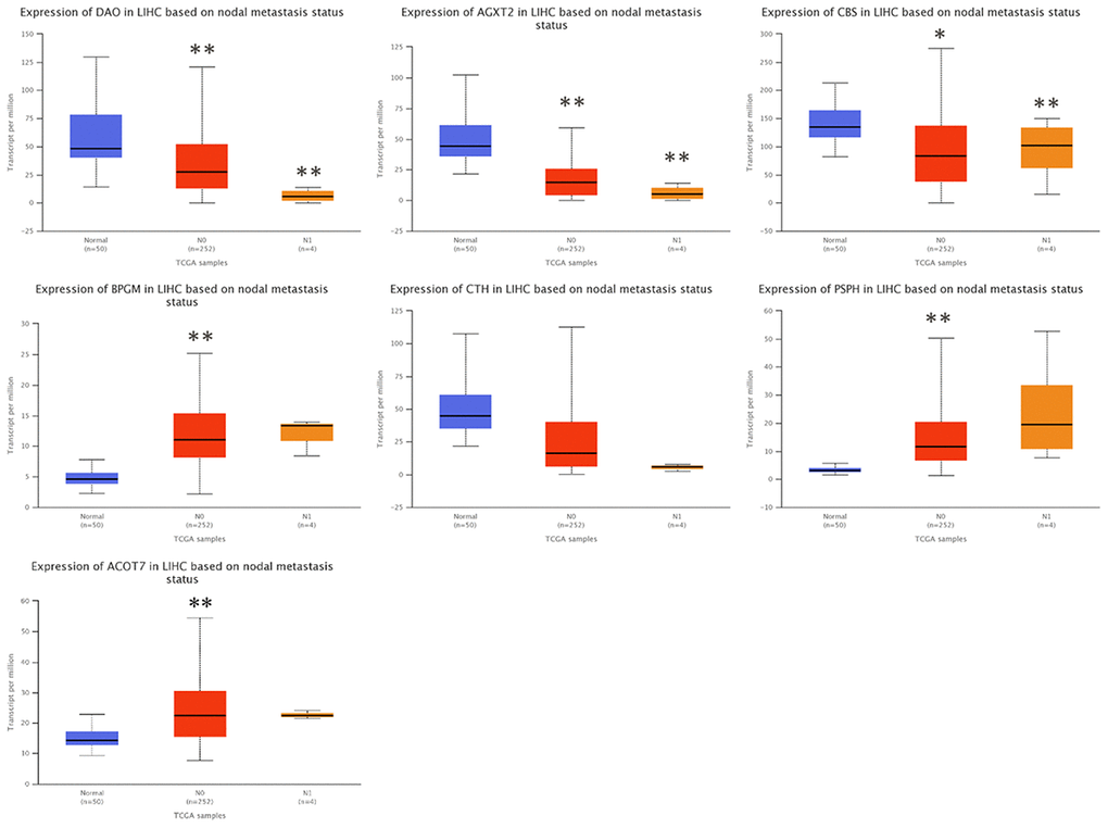 To investigate the clinical significance of candidate genes, a correlation analysis of clinical parameters with the mRNA expression of AGXT2, DAO, CTH, BPGM, CBS, PSPH, and ACOT7 in HCC patients was performed with UALCAN. Figures 6–8 shows that mRNA levels of BPGM (P < < 0.01), PSPH (P < 0.01), ACOT7 (P < 0.01) and CBS (P < 0.01) correlated positively with individual cancer stages, tumor grade, and nodal metastasis status. In contrast, DAO (P < 0.05) and AGXT2 (P < 0.01) mRNA levels were negatively correlated with individual cancer stages, tumor grade, and nodal metastasis status. In addition, there was also a negative correlation between individual cancer stages and tumor grade and the expression of CTH (P < 0.01), while there was no differential expression of CTH in different nodal metastasis statuses.