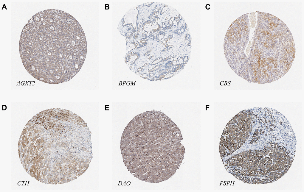 The results of immunohistochemical staining from the Human Protein Atlas (HPA) database indicated that there was higher expression of PSPH (antibody HPA020376) in LIHC tissues, while there were lower expression levels of AGXT2 (antibody HPA037382), BPGM (antibody HPA016493), CBS (antibody HPA001223), CTH (antibody HPA001223), and DAO (antibody HPA038653) in LIHC tissues (Figure 9). Unfortunately, the results of Acot7 immunohistochemical staining in LIHC tissues are not available in the HPA database. Except for BPGM, the other results were consistent with the mRNA expression levels in HCC.