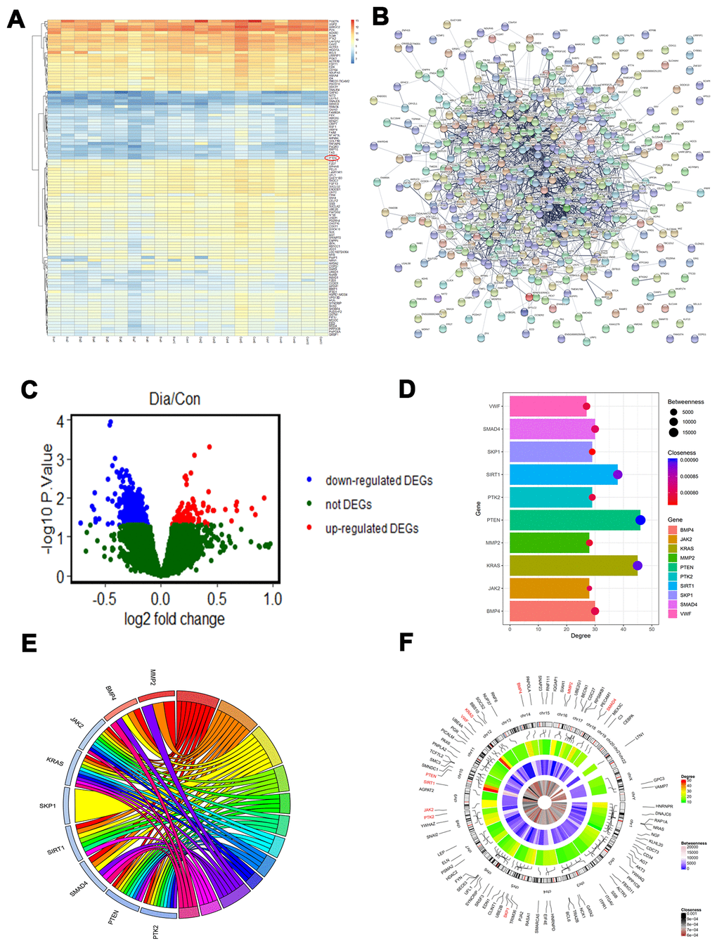 The GSE13760 data set based on the Affymetrix Human Genome U133A Array (GPL571) platform was retrieved from National Center for Biotechnology Information (NCBI) Gene Expression Omnibus (GEO) and included 10 patients with type 2 diabetes and 11 control subjects. The hierarchical clustering analysis of all DEGs (log2 fold change) is shown in the heatmap in Figure 1A. Upregulated and downregulated DEGs were identified (Figure 1B–1C). The network of protein protein interaction (PPI) was first constructed using STRING (https://string-db.org/). The top 10 hub genes with the highest degrees were then identified using Cytoscape software. These genes were PTEN, KRAS, SIRT1, SMAD4, BMP4, SKP1, PTK2, MMP2, JAK2, and VWF (Table 1). We performed functional and pathway enrichment analysis of the genes in the module. The top three terms were selected according to P value when more than three enriched terms were identified in each category (Table 2). The degree, betweenness, and closeness of each hub gene are shown in Figure 1D and 1E. Genes involved in the top three modules with the highest MCODE score were imported into DAVID (https://david.ncifcrf.gov/) for enrichment analysis. Under the term of biological process, DEGs were significantly enriched in cell adhesion, biological adhesion, and cell-cell adhesion. Under the term of molecular functions, DEGs were significantly enriched in receptor binding, protein complex, and intermediate filament binding. Results of enrichment analysis of hub genes are shown in Figure 1F.