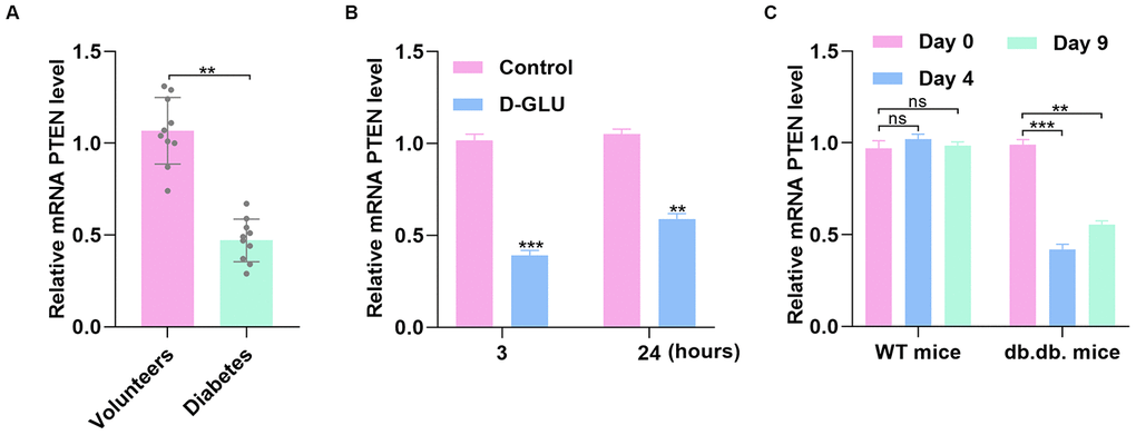 Because the informatics results indicated significantly different expression of PTEN between diabetic patients and healthy controls, we collected serum samples from patients with DFU and the controls to investigate the PTEN level between the two groups. Quantitative real-time polymerase chain reaction (qRT-PCR) analysis demonstrated that PTEN level was significantly reduced in the DFU group compared with controls (Figure 2A). To investigate whether PTEN level in HUVECs is affected by diabetic stimuli, PTEN expression was measured in HUVECs treated with phosphate-buffered saline (PBS) or D-glucose via qRT-PCR analysis. The results indicated that PTEN level was decreased in HUVECs stimulated with D-glucose at 3 and 24 hours (Figure 2B). Similarly, PTEN expression was significantly decreased at 4 and 9 days after wounding in diabetic mice, which was not be found in nondiabetic mice (Figure 2C).