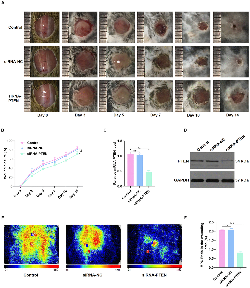 Next, C57BL/6 mice with full-thickness back wounds were locally injected with PBS, siRNA-NC, or siRNA-PTEN at days 0, 3, 5, 7, 10, and 14 after injury. The results showed that the repair process was significantly sustained by local siRNA-PTEN injection (Figure 3A–3B). At day 14 after injury, the skin tissues of the wound were collected to determine the PTEN level, and qRT-PCR and western blot (WB) results indicated that PTEN level was significantly decreased in the siRNA-PTEN group (Figure 3C–3D). Interestingly, Doppler detection found a weakened local mean perfusion unit (MPU) ratio consistent with the ability of this siRNA to delay wound repair (Figure 3E–3F).