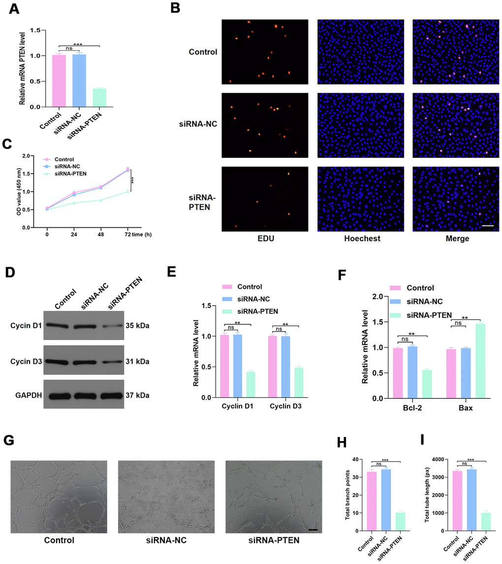 To investigate the effect of PTEN on HUVEC function, the siRNA-PTEN was constructed, and the qRT-PCR result confirmed the efficacy of this siRNA in knocking down the expression of PTEN (Figure 4A). To detect the proliferation of HUVECs in the different treatment groups, the EdU cell proliferation assay and the cell counting kit-8 (CCK8) proliferation assay were performed. The results indicated that proliferation of HUVECs was sustained following siRNA-PTEN treatment (Figure 4B–4C). Similarly, the proliferation-related genes Cyclin D1 and Cyclin D3 were found to be decreased in HUVECs treated with siRNA-PTEN (Figure 4D–4E). To investigate the effect of PTEN on the apoptosis of HUVECs, qRT-PCR was used to measure apoptosis-related genes levels and indicated a significant reduction of Bcl-2 expression and increasing Bax expression in the siRNA-PTEN group (Figure 4F). Moreover, the tube formation assay was performed to explore angiogenesis in the different groups and indicated a significant reduction of tube formation in the siRNA-PTEN group (Figure 4G–4I).