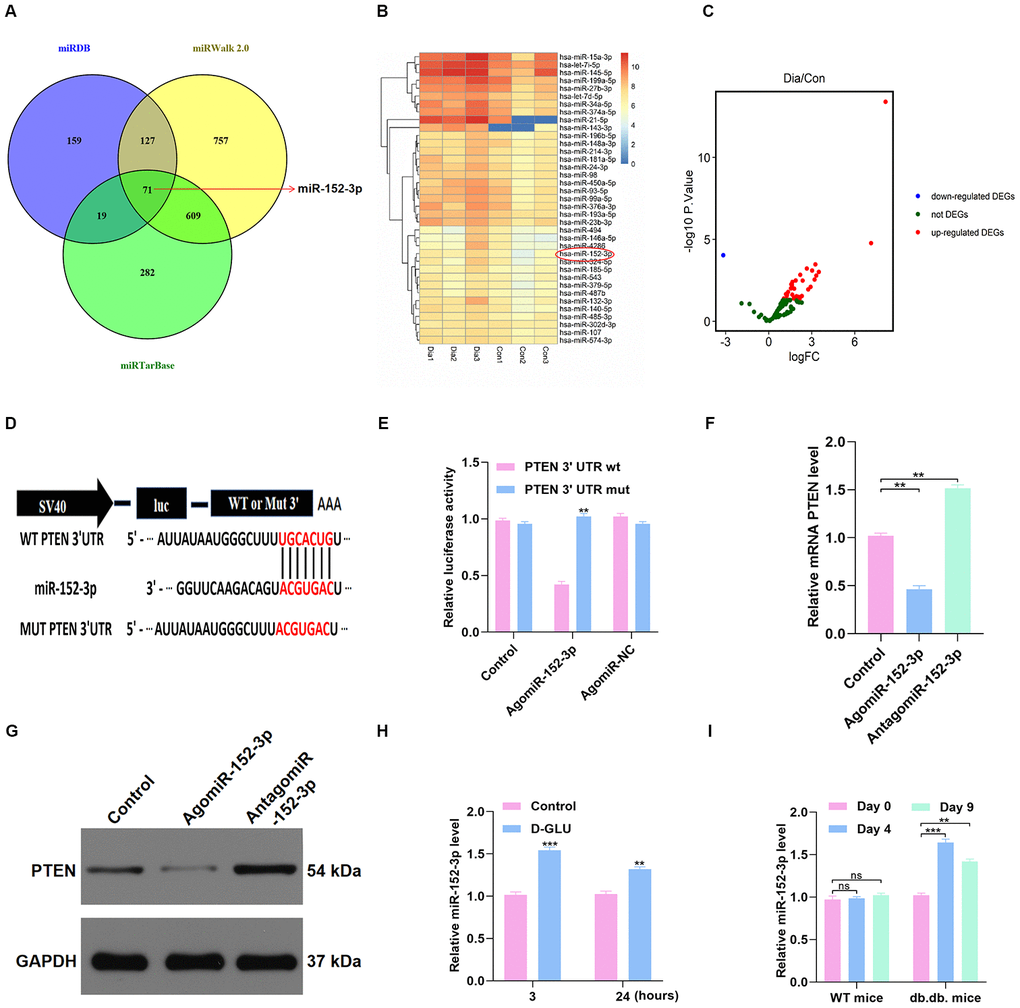 The underlying upstream mechanism of PTEN was then investigated using online predicting tools, including miRTarBase (http://mirtarbase.mbc.nctu.edu.tw/php/index.php), miRDB (http://mirdb.org/), and miRWalk (http://zmf.umm.uni-heidelberg.de/apps/zmf/mirwalk2/). The results showed that miR-152-3p is a potential upstream miRNA (Figure 5A). The GSE84971 data set from the GEO database was used to identify the differentially expressed miRNAs between DFU patients and controls, and miR-152-3p was found to be a key differentially expressed miRNA (Figure 5B–5C). Thus, the luciferase assay was carried out to verify the association between miR-152-3p and PTEN. We found that miR-152-3p could specifically bind to the predicted target region of the PTEN mRNA (Figure 5D–5E). In addition, miR-152-3p overexpression resulted in suppression of PTEN expression in HUVECs (Figure 5F–5G). Moreover, we found that miR-152-3p expression was increased by D-glucose stimulation at 3 and 24 hours (Figure 5H). Similarly, miR-152-3p expression was significantly increased at 4 and 9 days after surgery in diabetic mice; this was not seen in nondiabetic mice (Figure 5I).