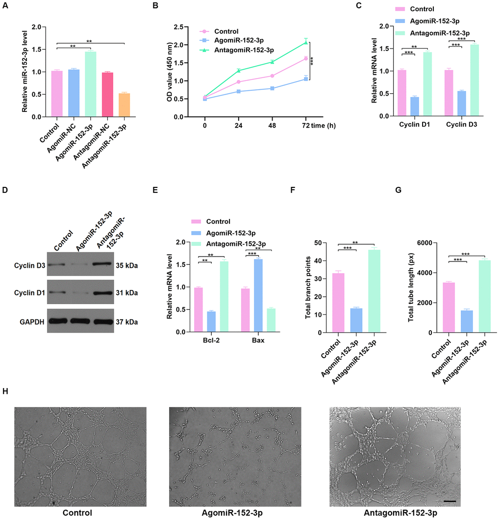 To investigate the effect of miR-152-3p on HUVEC function, miR-152-3p agonist (agomiR-152-3p) and miR-152-3p antagonist (antagomiR-152-3p) were constructed. The qRT-PCR results confirmed that miR-152-3p agonist and antagonist affect the expression of miR-152-3p (Figure 6A). CCK8 proliferation assay results indicated enhanced proliferation of HUVECs after antagomiR-152-3p treatment (Figure 6B). In addition, the qRT-PCR and WB results indicated that antagomiR-152-3p induces HUVEC proliferation and suppresses apoptosis (Figure 6C–6E). The effect of antagomiR-152-3p on angiogenesis in HUVECs was also measured, using the tube formation assay; results indicated a significant enhancement of tube formation in HUVECs after antagomiR-152-3p treatment (Figure 6F–6H).