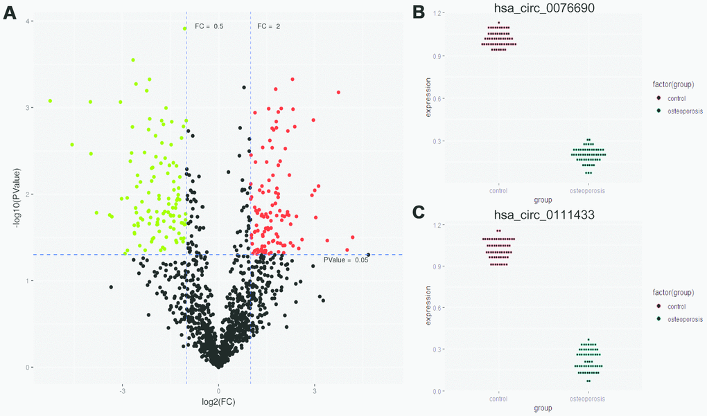 Differentially expressed circRNAs between osteoporosis and control group was demonstrated by Volcano plot, which was drawn by ggplot2 package. The diagnostic values of candidate circRNAs were measured by ROC curve analysis and the areas under the curve (AUC) were calculated by R. Target prediction was performed by TargetScan and miRanda software. All experiments data are representative of independent triplicate experiments and the statistical analysis was performed using R. Statistically significant was set to P-value < 0.05.