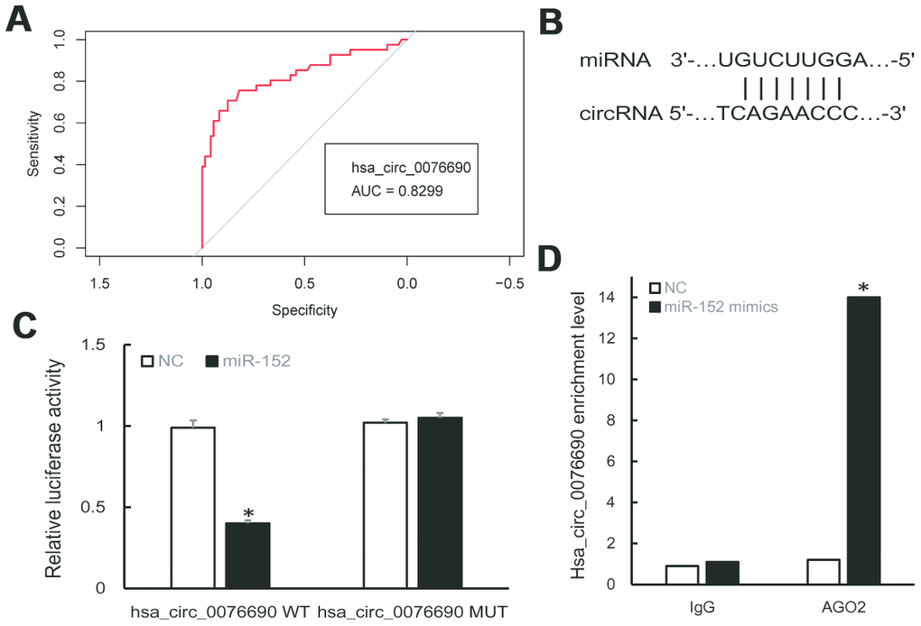 With the development of RNA sequencing technology, a large number of circRNAs have been identified in mammalian cells [17]. Increasing evidence showed that circRNAs may act as novel candidate biomarkers for medical diagnosis on the disease [18, 19]. For example, the up-regulation of circRNA_002453 in lupus nephritis patients was associated with renal involvement [20]. Wu found that hsa_circ_0054633 was highly expressed in gestational diabetes mellitus patients and exhibited a significant diagnostic value [21]. By means of circRNA-seq and bioinformatics analysis, we identified hundreds of differentially expressed circRNAs between osteoporosis and control samples. Among these circRNAs, we found that hsa_circ_0076690 and hsa_circ_0111433 were significantly down-regulated in osteoporosis samples compared to control, with fold change of -20.77 and -16.29, respectively. The expression level of hsa_circ_0076690 and hsa_circ_0111433 was further validated by qRT-PCR experiments in 57 pairs of osteoporosis patients and non-osteoporosis healthy subjects. Subsequently, we performed Pearson Correlation and ROC curve analysis, the results revealed that hsa_circ_0076690 might serve as a candidate diagnostic biomarker for osteoporosis, which could distinguish patients with osteoporosis from healthy controls.