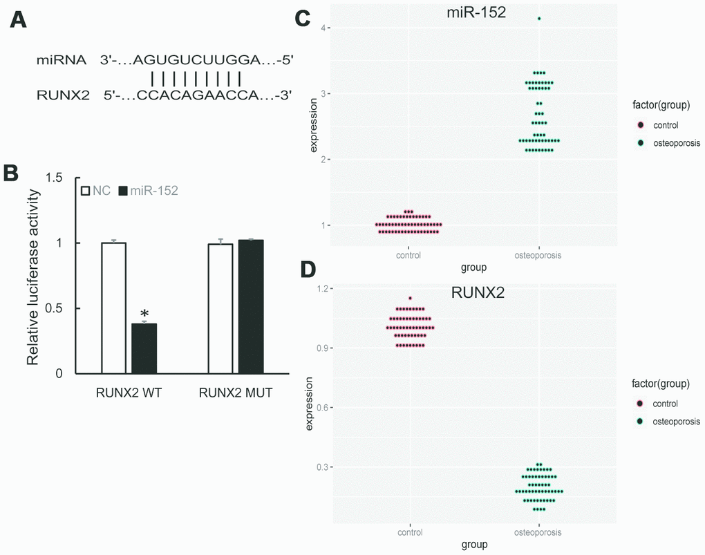 We further predicted the downstream targets of miR-152 by bioinformatics algorithm and found that RUNX2 was a potential target (Figure 3A). A subsequent dual-luciferase reporter assay revealed that the luciferase activity was repressed by miR-152 mimics in RUNX2 wild type, whereas the mutated luciferase reporter showed no changes (Figure 3B). In addition, qRT-PCR demonstrated that miR-152 expression was significantly increased in OP samples compared to control (Figure 3C), while RUNX2 expression was decreased (Figure 3D).