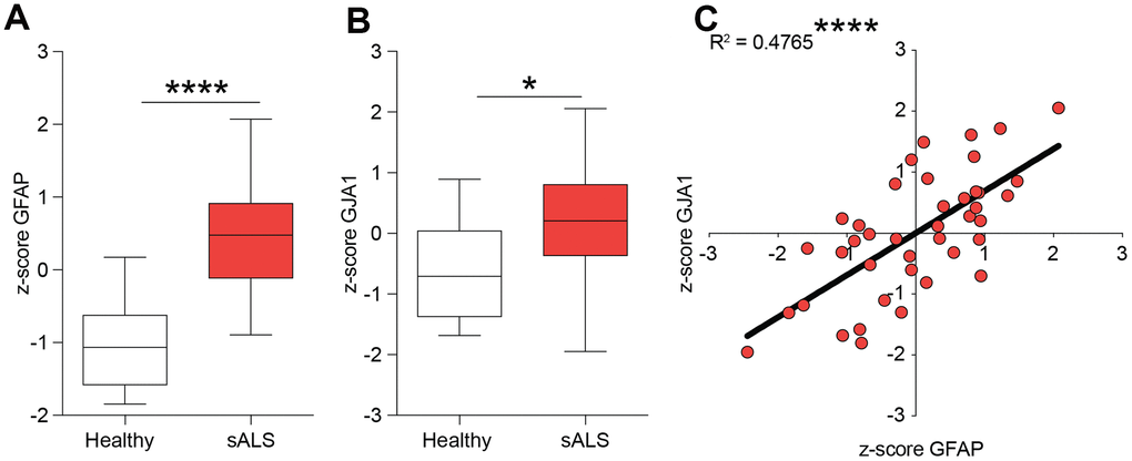 We first tested the hypothesis of a potential role of Cx43 in human ALS analysing the z-score of mRNA expression levels in the central nervous system of control and sporadic (s)ALS patients. We used the NCBI Gene Expression Omnibus (GEO) database (http://www.ncbi.nlm.nih.gov/geo/) to select human healthy and ALS gene expression dataset. We analysed the GFAP (encoding for the glial fibrillary acidic protein) and GJA1 (encoding for Cx43) expression levels in central nervous system biopsies of healthy and sALS patients. Our analysis revealed that in sALS patients both GFAP and GJA1 mRNA levels were significantly increased as compared to the healthy counterpart (Figure 1A, 1B). We then moved to analyse a potential correlation between GFAP and GJA1 performing a linear regression analysis, finding a positive correlation between tested genes in human sALS central nervous system (r2 = 0.4765, p-value < 0.0001, Figure 1C).