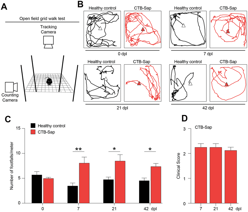 In order to analyse the effects of motoneuronal loss and its impact on behavioural and neuropathological signs in vivo, we established a model of spinal motoneuronal depletion induced by the neuronal targeting toxin CTB-Sap, which is retrogradely transported throughout axons to the spinal cord. We evaluated the behavioural impact of motoneuronal loss at 0, 7, 21 and 42 days post-lesion (dpl), performing an open field grid walk test (Figure 2A), tracking the distance covered by mice during the task with a tracking camera, and the number of footfalls over meter with a counting camera (Figure 2A). We found that both healthy control and CTB-Sap lesioned mice were active in the performance and covered an average distance of 3.2 ± 0.5 and 4.2 ± 1.0 meters, respectively (p-value > 0.444, Figure 2B). We also found that CTB-Sap lesioned mice showed a significant increase of the rate of errors as soon as 7 dpl and that such motor coordination impairment was retained up to 42 dpl (Figure 2C). We confirmed this evidence evaluating the clinical impairment during the time course of disease. Our data indicate that lesioned mice presented a stable impairment and a clinical score of about 2 (Figure 2D), showing leg extension towards the lateral midline and also affected stepping during locomotion test.