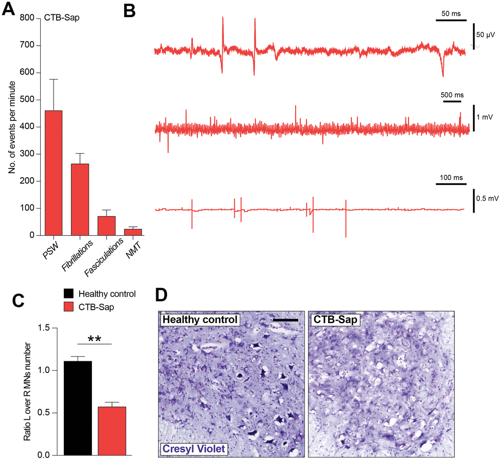 In order to better characterize the denervation in CTB-Sap-injected mice, we performed an electromyographic recording into the left gastrocnemius muscle to find signs of denervation and spontaneous electrical activity. The results of our analysis are reported in Figure 3A, 3B and show that CTB-Sap induces muscle denervation, as suggested by a relevant number of positive sharp waves, fibrillations, fasciculations and neuromyotonia (Figure 3B). Of note, our electromyographic analysis found no obvious signs of myopathy.