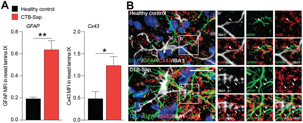 Herein we investigated Cx43, the most abundant GJs- and HCs-forming protein of the central nervous system, and its possible role in human ALS, as well as in the CTB-Sap model [13, 14]. We have shown that Cx43-reactive expression may represent the biological substrate underlying reactive glial activation and neuronal suffering in neurodegenerative diseases.