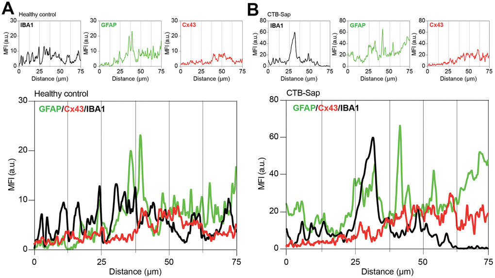 The relevance of astroglial Cx43 in human ALS prompted us to evaluate a potential involvement of this Cx in a reductionist model of spinal motoneuronal loss induced by CTB-Sap. We assessed Cx43 expression in our model, by measuring the Cx43 mean fluorescence intensity (MFI) in the spinal cord of healthy control and CTB-Sap mice, finding a significant MFI increase in GFAP and Cx43 levels in Rexed lamina IX of motoneuronal depleted spinal cord (Figure 4A, 4B). Such an increase was coupled with morphological changes in astroglial (i.e. GFAP positive) and microglial (i.e. IBA1 positive) cell populations (Figure 4B). Finally, we analysed the profile plot of GFAP, IBA1 and Cx43 in the spinal cord of healthy control (Figure 5A) and CTB-Sap-lesioned (Figure 5B) mice, confirming an increased colocalization between Cx43 and GFAP/IBA1 (Figure 5A, 5B).