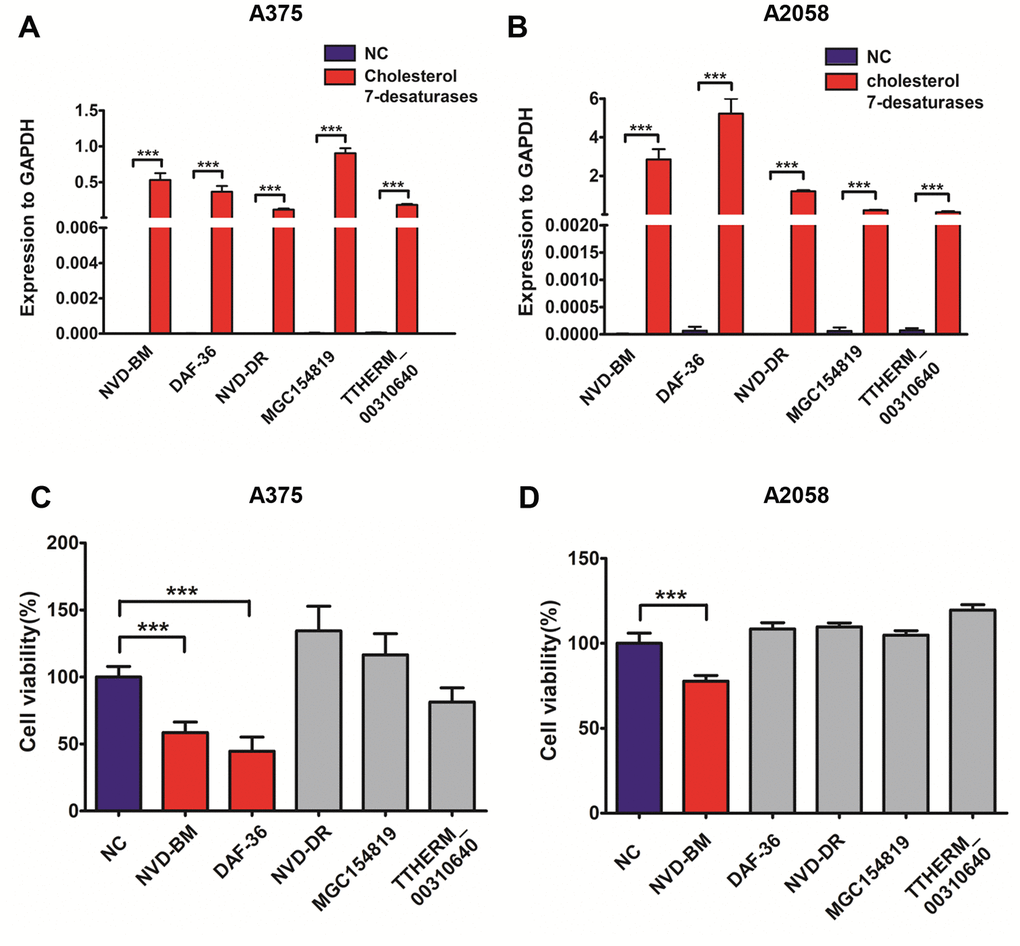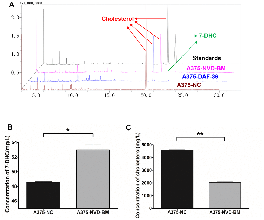 To test cholesterol 7-desaturase capability in converting cholesterol to 7-DHC, we extracted sterols from A375 cells with the expression of cholesterol 7-desaturases, and determined cholesterol and 7-DHC concentrations using GC-MS (Figure 4A). Our data revealed that NVD-BM converted cholesterol to 7-DHC, and was 2.1 folds compared with NC group (Figure 4B, 4C). DAF-36 failed to convert cholesterol to 7-DHC in A375 cells, suggesting that DAF-36 inhibited A375 cell proliferation via alternative, non-cholesterol mediated mechanisms. Therefore, NVD-BM appeared to effectively inhibit melanoma growth via cholesterol degradation, to increase 7-DHC levels in cells. This observation was consistent with the previous report showing that the proliferation of melanoma cells was inhibited by 7-DHC addition (Supplementary Figure 1).