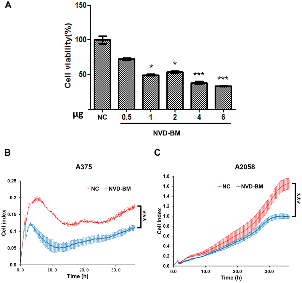 Since no cholesterol 7-desaturases exists in mammalian cells, we optimized codon usage and synthesized several cholesterol 7-desaturases from other species; DAF-36 from Caenorhabditis elegans, NVD-BM from Bombyx mori, NVD-DR from Danio rerio (zebrafish), TTHERM_00310640 from Tetrahymena thermophila SB210 and MGC154819 from Xenopus laevis (Table 1, Supplementary Table 1). This approach facilitated anti-cancer studies in melanoma cells. Using transient transfection, the five humanized cholesterol 7-desaturases were expressed in A375 and A2058 melanoma cells by qRT-PCR assay (Figure 1A, 1B). Cell proliferation assays showed that the expression of NVD-BM significantly slowed cell growth of melanoma cells (A375 and A2058), however, DAF-36 failed to suppress A2058 cell proliferation and other cholesterol 7-desaturases did not inhibit melanoma cell proliferation (Figure 1C, 1D). Furthermore, the proliferation effects exerted by NVD-BM expression were dose dependent in A375 cells (Figure 2A). We next investigated cell migration capabilities in cells expressing NVD-BM, using the real-time cell analysis (RTCA). These data showed that A375-NVD-BM and A2058-NVD-BM cell migration capabilities were lower than the empty vector negative control (NC) group at 36 h, suggesting that NVD-BM severely impaired melanoma cell migration (Figure 2B, 2C).