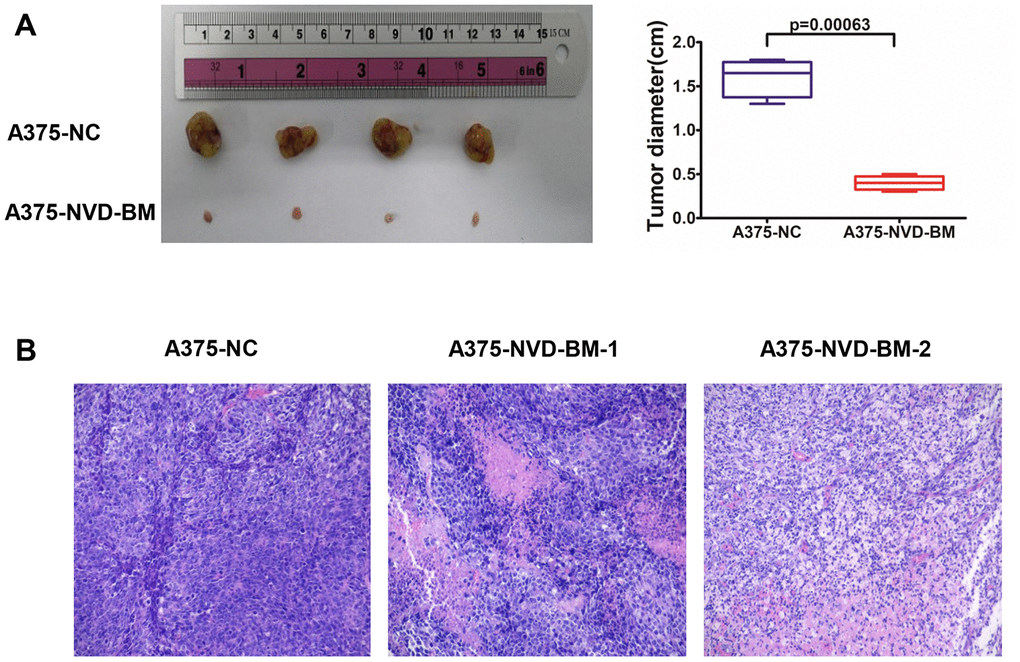 The proliferation and migration inhibitory capabilities of NVD-BM in melanoma cells suggested anti-tumor effects in vitro, therefore we sought to recapitulate these effects in vivo. To confirm the anti-tumor effects of NVD-BM in vivo, A375 cells expressing NVD-BM and the empty vector NC, were subcutaneously injected into BALB/c-nu/nu mice (n = 4). Mice were sacrificed at the end of the fourth week, with tumors excised, measured and stained with hematoxylin-eosin (HE). Our data demonstrated that tumor diameter from A375 cells expressing NVD-BM, were approximately four folds smaller significantly than the NC group (p = 0.00063) (Figure 3A). Moreover, overall tumor structures were almost normal, and displayed no obvious necrosis (Figure 3B). In contrast, the NC group displayed large areas of necrosis, nuclear degradation and cytoplasmic protein degradation. These data demonstrated that NVD-BM served as an effective tumor suppressor in melanoma derived cells in vivo.