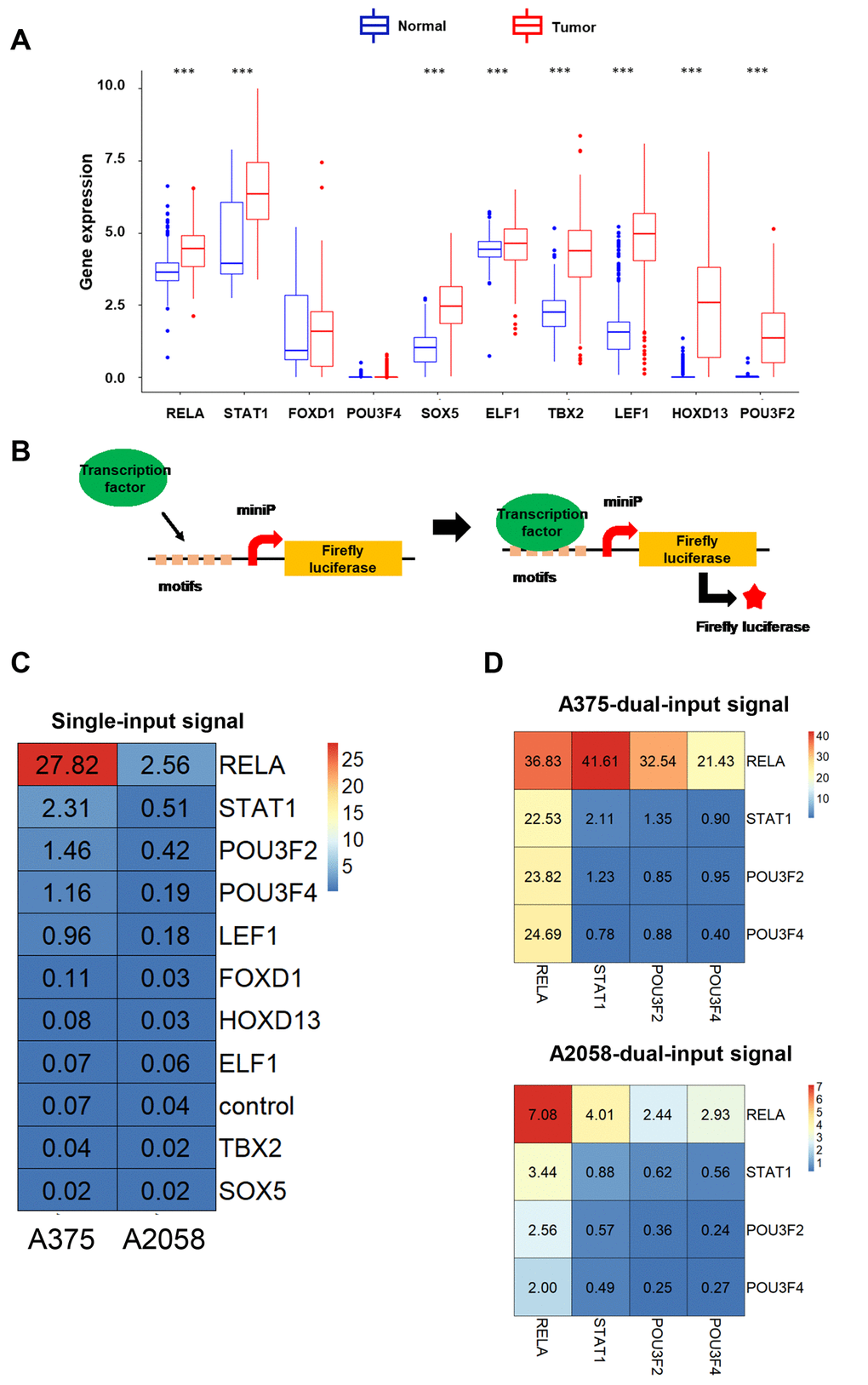 To enhance the efficacy and specificity of NVD-BM, based on a genetic circuit, we were ought to scan highly expressed transcription factors as dual-input sensors. We compared gene expression profiling data from melanoma tissue with normal skin tissue, and identified several differentially expressed melanoma genes. The top 10 highly expressed transcription factors, RELA, STAT1, FOXD1, POU3F4, SOX5, ELF1, TBX2, LEF1, HOXD13 and POU3F2, were then evaluated for their ability to drive luciferase expression (Figure 5A). Five repetitive transcription factor binding motifs were separately cloned into firefly luciferase vectors, driven by mini-promoters, to determine firefly luciferase expression in A375 and A2058 cells (Supplementary Table 2, Figure 5B). As shown in Figure 5C, RELA, STAT1, POU3F2 and POU3F4 were the top four input signals in A375 and A2058 cells. Next, vectors with different input signals, were divided into 16 permutation methods. Heatmaps showed that the optimum match was RELA and STAT1 in A375 and A2058 cells, respectively (Figure 5D). Finally, RELA and STAT1 were selected as dual-input signals for a genetic biosensor in melanoma cells.