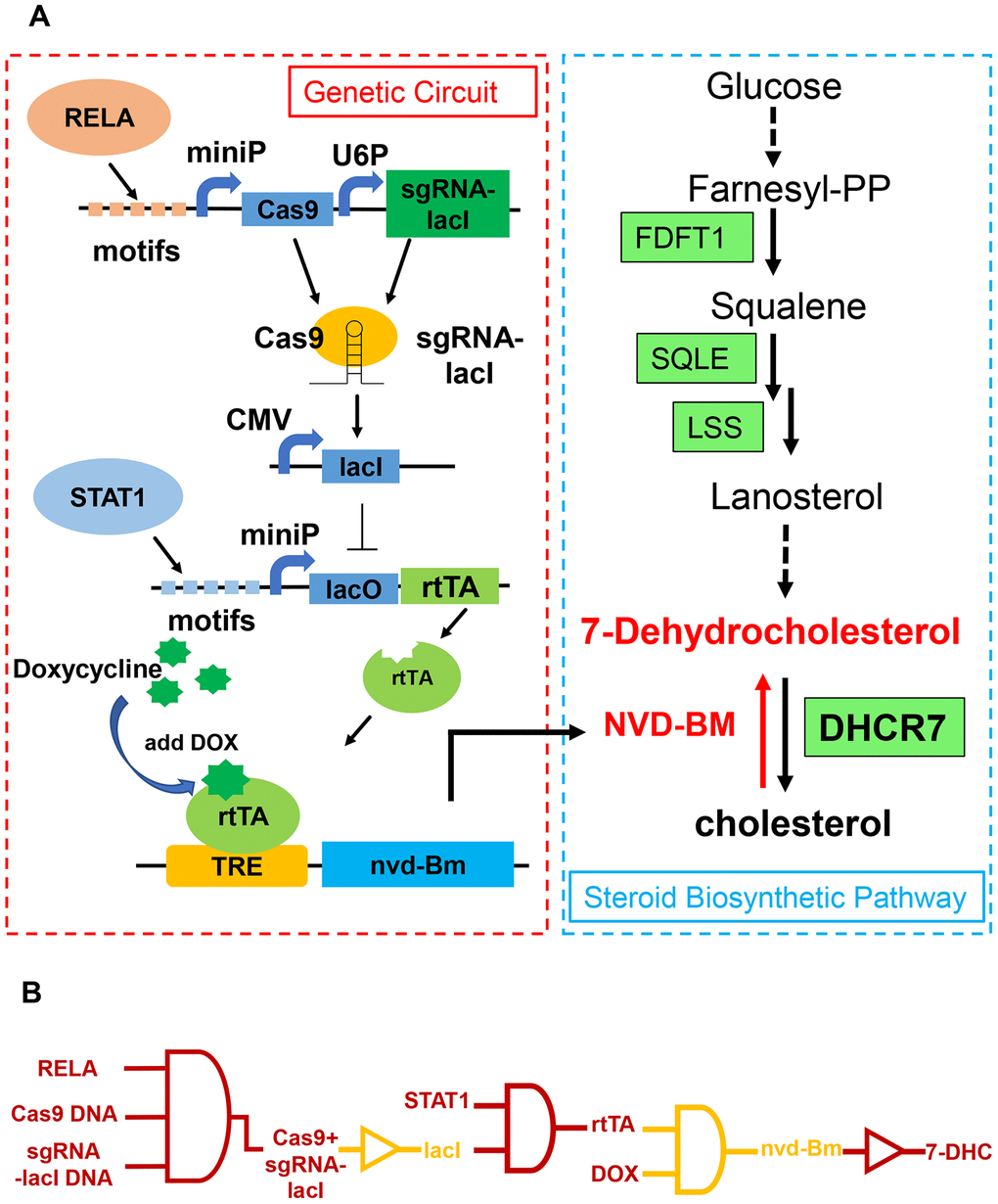 Synthetic cell-based therapies are ideal approaches for metabolic disorders, as they circumvent the shortcomings of conventional therapies, such as frequent administration and self-sufficient doses. Genetic circuits are typically composed of a sensor, processor and actuator [35]. From our results, NVD-BM was an ideal actuator in promoting 7-DHC accumulation in skin cancer. To ensure specificity, safety and efficacy of the genetic circuit, the sensor and processor were composed of four independent modules, which sensed highly expressed transcription factors in tumors, and activated downstream step by step. The CRISPR-Cas9 system and the Tet-on switch were central to our genetic circuit, guide RNA and Cas9 device were detached on separated module and dimerized once sensing up-regulated transcription factors. RELA and STAT1 binding motifs were blocked, and the switch was activated by doxycycline. Our results showed that RELA and STAT1 activated NVD-BM expression in the presence of doxycycline, and slowed melanoma cell growth and migration. However, endogenous transcription factors usually function as “master regulators”, exerting control over processes that specify cell types and developmental patterning in normal cells. Hence, preventing signal leakage and accurately setting specific threshold values that distinguish tumor and normal cells to trigger circuit activation, should be investigated in the future.