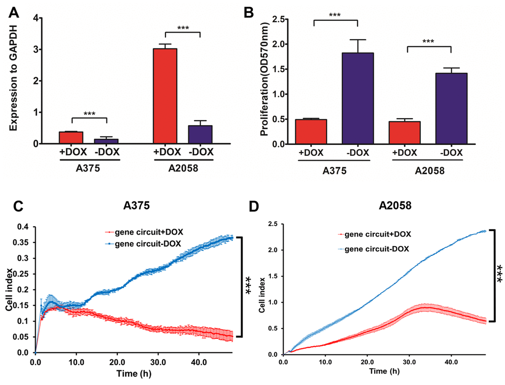 We next developed a molecular switch combined with CRISPR-Cas9 and TET-ON, with four modules to activate NVD-BM expression and inhibit melanoma cell growth and decrease migration rates (Figure 6A). Five repetitive motifs from RELA (5’- GGGAATTTCC-3’), Cas9 and sgRNA, targeting the lacI gene were assembled into one construct, facilitating RELA binding to induce Cas9 expression. The Cas9 protein with sgRNA-lacI in the next module, inhibited lacI expression. Five repetitive motifs from STAT1 (5’- CATTTCCCGGAAACC-3’), lacO and rtTA were constructed in one vector, recruiting STAT1 binding to induce rtTA expression. In case of toxicity, NVD-BM was not expressed without doxycycline. When doxycycline was added to the culture medium, it entered cells and bound rtTA. Then, rtTA and doxycycline bound to the TRE gene to activate NVD-BM expression. Thus, when RELA and STAT1 were up-regulated in a tumor, parallel to doxycycline added in vitro, the genetic circuit was then switched on (Figure 6B).