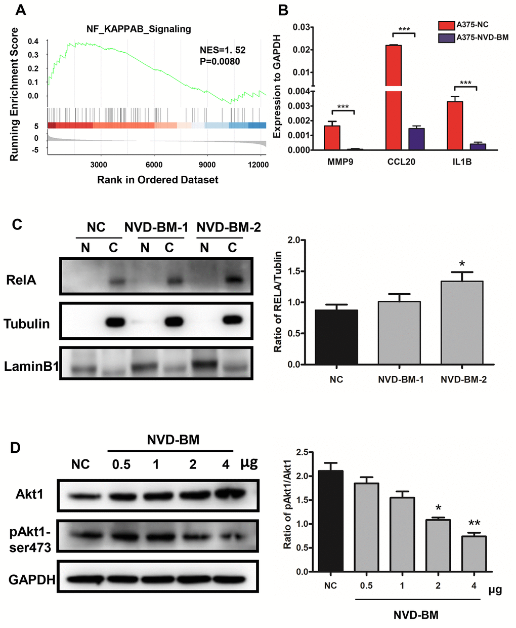 Enhanced NF-κB activation, as a result of upstream signaling dysregulation, is a main molecular characteristic in melanoma [38]. Indeed, GSEA analysis of GSE3189 transcriptomic data between normal skin and melanoma samples, demonstrated that NF-κB signaling was up-regulated in melanoma patients (Figure 8A). Thus, we determined the expression of known NF-κB targets in melanoma, e.g., MMP9, CCL20 and IL1B [39, 40]. RT-PCR data demonstrated that MMP9, CCL20 and IL1B expression was significantly down-regulated by NVD-BM (Figure 8B). Similarly, by investigating the cellular localization of free RELA, which is an important transcription factor implicated in NF-κB signaling, we noted that RELA accumulated in the cytoplasm by western blot assay, in a dose dependent NVD-BM manner (Figure 8C), thus, suggesting that RELA translocation to the nucleus was inhibited under these conditions. Next, we determined the phosphorylation status of an upstream NF-κB kinase by western blot assay, and found that Akt1-ser473 phosphorylation was decreased by NVD-BM, in a dose dependent manner (Figure 8D). Collectively, these data indicated that NVD-BM promoted tumor regression by decreasing phosphorylated Akt1 levels, and inhibiting free RELA translocation into the nucleus in melanoma cells.