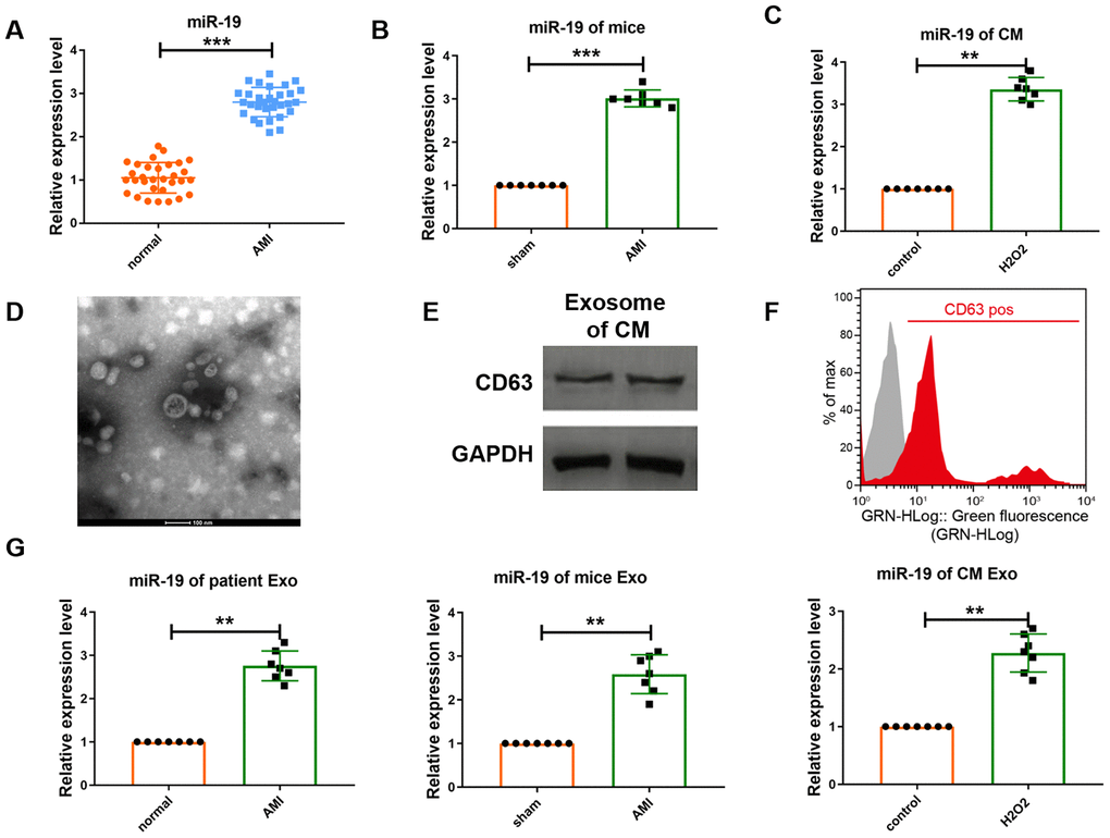 Recent study has shown that miRNAs are actively secreted in extracellular vesicles especially exosome, which highlights their underlying effect to act as paracrine signaling molecules [7]. Here we first detected the serum level of miR-19a-3p in patients with acute myocardial infarction (AMI). Real-time PCR (RT-PCR) analysis indicated that the level of miR-19a-3p was increased in patient’s serum compared to normal control (Figure 1A). To further analyze the expression of miR-19a-3p, we then constructed the myocardial infarction (MI) mice model. The result detected by qRT-PCR was the same as before (Figure 1B) Furthermore, we also collected the culture medium of cardiomyocytes and analyzed the level of miR-19a-3p. As a result, it also upregulated in response to the stimulation of H2O2 (Figure 1C). These results indicate that myocardial infarction was one of the reasons to induce the expression of miR-19a-3p. And then, we want to confirm whether miR-19a-3p was transferred by exosome. Exosomes were separated from culture medium of cardiomyocytes using ultracentrifugation. Electron microscopic analysis showed a typical size of 30-150 nm and a characteristic cup-shaped morphology (Figure 1D), that has been seen as a majority of isolated exosomes [8]. Then, western blot analysis was used to detect the expression of exosome marker CD63 (Figure 1E). Flow cytometry analysis (FACS) also confirmed the expression of CD63 (Figure 1F). Moreover, miR-19a-3p expression was examined from serum of MI patient and mice and culture medium of cardiomyocytes, respectively, and actually increased (Figure 1G). These results indicate that miR-19a-3p secreted form cardiomyocytes were upregulated in response to MI and H2O2.