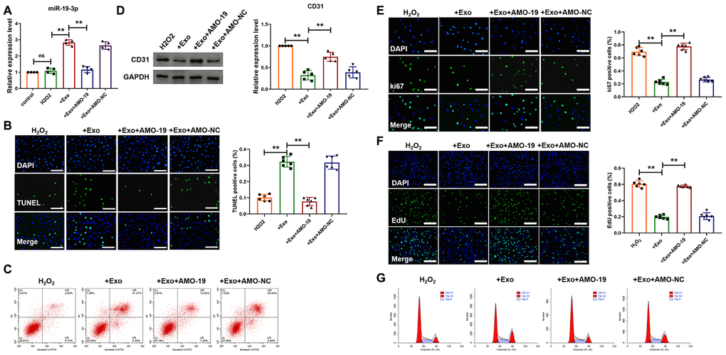 Next, we want to determine whether miR-19a-3p from cardiomyocytes could act on endothelial cells by exosome pathway. First, neonatal mice cardiomyocytes were subject to H2O2 (50 μΜ) for 3 h to simulate ischemic injury of cardiomyocytes in vitro. And then, exosomes were separated from condition medium of cardiomyocytes and added to the endothelial cells culture medium for 48 h, in which cells were also treated with H2O2 for 3 h. AMO-miRNA is a kind of anti-miRNA-oligonucleotides that causes the degradation of target miRNA. AMO-19 was transfected to inhibit the expression of miR-19a-3p. As shown in Figure 2A, there was little difference of miR-19a-3p level between endothelial cells after H2O2 treatment and control group. However, Addition of exosome increased miR-19a-3p level of endothelial cells and it was decreased after AMO-19 transfection (Figure 2A). These data indicate that exosome containing miR-19a-3p from cardiomyocytes can be uptake by endothelial cells. Then we wanted to explore the function of miR-19a-3p in endothelial cells in ischemic condition in vitro. TUNEL staining and flow cytometry was performed to detect endothelial cells apoptosis and addition of exosome elevated H2O2 induced endothelial cells apoptosis and AMO-19 transfection inhibited endothelial cells apoptosis (Figure 2B and 2C). Furthermore, western blotting showed the downregulation of endothelial cell marker CD31 in exosome addition group. Transfection of AMO-19 elevated the expression level of CD 31 (Figure 2D). Meanwhile, immunofluorescence staining analysis showed that ki-67 positive staining cells’ number were decreased after the treatment of exosome from cardiomyocytes compared to no treatment group. Giving AMO-19 significantly diminished that effect and promote the proliferation of endothelial cells (Figure 2E). In addition, treatment of exosomes collected from cardiomyocytes significantly alleviated cell cycle of endothelial cells and AMO-19 transfection abolished the inhibitory effect (Figure 2F and 2G). These data suggest that inhibition of miR-19a-3p promotes the survival and proliferation of endothelial cells in ischemic injury in vitro.