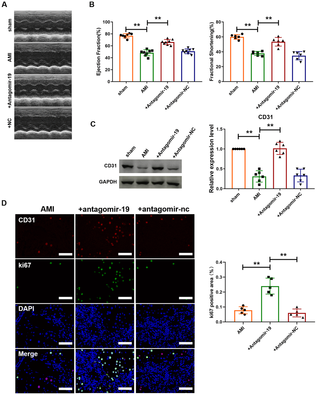 We further investigated the effect of silencing miR-19a-3p on heart function of MI mice. As shown in Figure 3A, echocardiographic assessment was performed to determine the systolic and diastolic function of heart. Administration of antagomiR-19a-3p reversed the damage of heart contractility caused by MI. However, antagomir-NC had no effect. In addition, Fractional Shortening (FS) and Ejection Fraction (EF) were also detected (Figure 3B). And compared with MI group, both of them were recovered after miR-19a-3p silence. In contrast, EF and FS values were not changed in antagomir-NC transfected hearts after MI (Figure 3B). Then, we further examined the effect of miR-19a-3p on angiogenesis in mice MI model. MI significantly decreased the expression level of CD31 in mice heart. In contrast, the expression of CD31 in antagomiR-19a-3p transfected hearts were elevated compared with un-transfected group after MI (Figure 3C). In addition, immunofluorescence staining analysis indicated that the number of ki67 and CD31 double positive staining cells were increased in MI mice with administration of antagomiR-19a-3p compared to no-treat group, which suggested the proliferation of endothelial cells (Figure 3D). Collectively, these data suggest that miR-19a-3p inhibition promotes the proliferation of endothelial cells and angiogenesis and improves heart function.