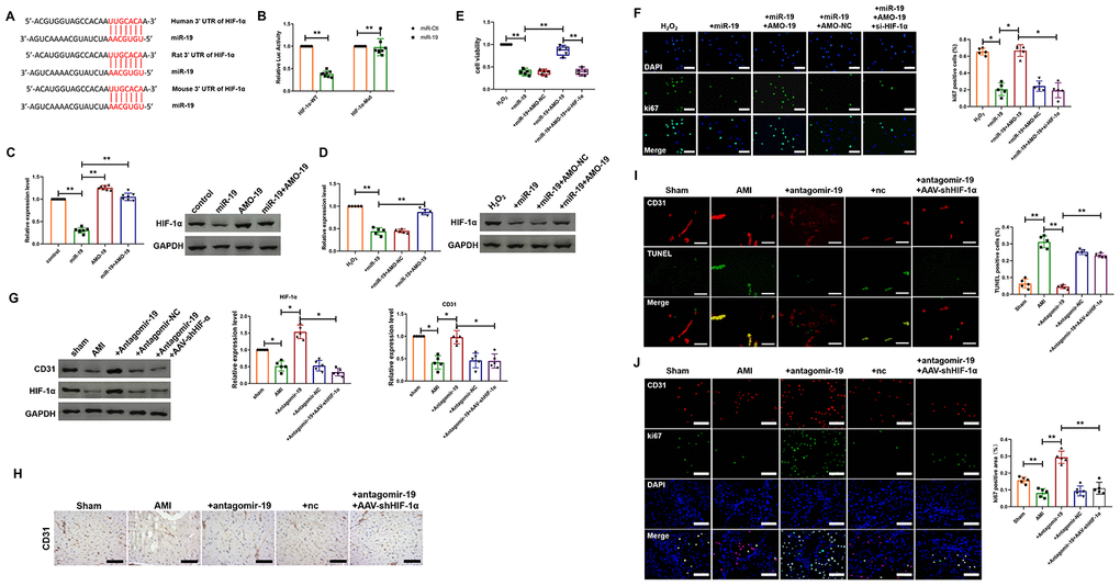 Hypoxia inducible factor alpha (HIF-1α), a key cellular survival factor, plays crucial roles in response to hypoxia condition and has been identified to mediate important cardioprotective function. Furthermore, previous study has indicated that upregulated expression of HIF-1α promoted angiogenesis and resulted in increased tissue perfusion in animal models of ischemic cardiovascular disease [9, 10]. However, the relationship between miR-19a-3p and HIF-1α has not been indicated in endothelial cells. First, we used TargetScan (http://www.targetscan.org/) to forecast the potential interaction between miR-19a-3p and HIF-1α and one -binding site of miR-19a-3p in the 3’-UTR of HIF-1α mRNA was identified (Figure 4A). And as shown in Figure 4B, luciferase assay was performed and showed that miR-19a-3p, which had no effect on the vector that carries mutations of the binding site (HIF-1α-Mut), inhibited the activity of wild-type HIF-1α luciferase vector (HIF-1α-WT). To further identify HIF-1α as the target gene of miR-124 in endothelial cells, both loss-of-function and gain-of-function approaches were applied. AMO-19 increased the expression of HIF-1α in cultured endothelial cells, whereas miR-19a-3p alleviated the level of HIF-1α (Figure 4C). In contrast, co-treatment of miR-19a-3p and AMO-19 reversed the inhibition effect of miR-19a-3p transfection on the expression of HIF-1α (Figure 4C). These data suggest that HIF-1α may be one of the target genes of miR-19a-3p. Next, we explore if HIF-1α is involved in the attenuation of proliferation of endothelial cells induced by miR-19a-3p delivery. To confirm this, we transfected endothelial cells with either miR-19a-3p, AMO-19 or AMO-NC and then treated with H2O2. Western blot analysis showed that H2O2 increased HIF-1α protein levels, which was reversed by miR-19a-3p transfection (Figure 4D). Compared with NC group, AMO-19 significantly increased the expression level of HIF-1α (Figure 4D). MTT assay was performed to detect endothelial cell viability and it was inhibited in miR-19a-3p group. However, cell viability was elevated by administration of AMO-19 and interference of HIF-1α using siRNA significantly abolished this recovery effect (Figure 4E). Representative ki67 staining of endothelial cells with different treatment way were displayed in Figure 4F. Inhibition of HIF-1α expression attenuated the proliferation of endothelial cells caused by AMO-19 (Figure 4F). Then, in vivo study was also performed to investigate the role of miR-19a-3p on angiogenesis. Western blot showed that administration of antagomir-19 increased the protein levels of CD31 and HIF-1α, which was inhibited by AMI (Figure 4F). Co-infection of AAV5-shHIF-1α reversed the effect of AMO-19 and inhibited the level of CD31 and HIF-1α (Figure 4G). Moreover, immunohistochemical staining also indicated the elevation of CD31 level after antagomir-19 administration in mice with MI injury and reduction after knockdown of HIF-1α level (Figure 4H). Furthermore, TUNEL and the immunofluorescence staining results showed that administration of antagomir-19 inhibited cell death and promoted endothelial cell proliferation. And AAV5-shHIF-1α infection partially blocked the proliferation of endothelial cells and elevated the number of TUNEL positive cells compared with antagomiR-19a-3p administration group. (Figure 4I and 4J). These data show that downregulation of HIF-1α is involved in miR-19a-3p mediated inhibition of endothelial cells proliferation.