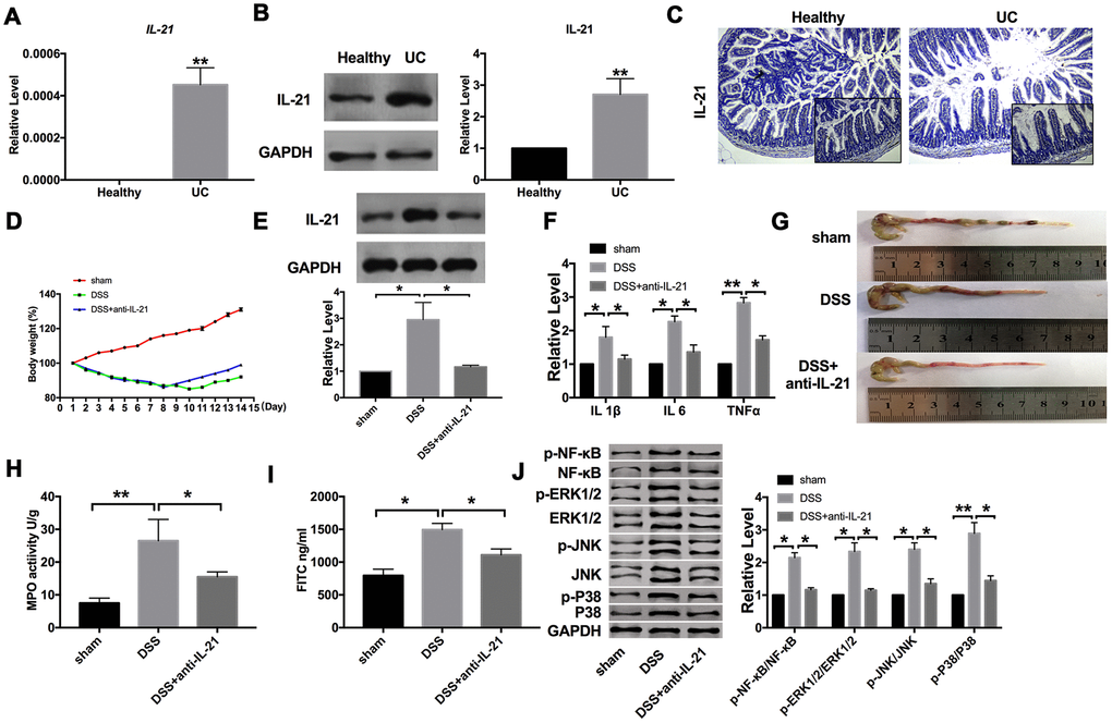 For further research, we established a C57BL/6 mouse model of acute colitis with DSS and treated it with IL-21 neutralizing antibody. Compared with the DSS group, the bodyweight of mice treated with anti-IL-21 recovered (Figure 1D). After assessing the level of IL-21, we found that DSS induced the expression of IL-21, which was recovered by anti-IL-21 (Figure 1E). Further, we found that DSS induced the expression of inflammatory cytokines (IL1β, IL6, and TNFα). Compared with the DSS group, the expression of IL1β, IL6, and TNFα were decreased in anti-IL-21 treated mice (Figure 1F). We found that mice treated with IL-21 neutralizing antibody had a protective effect on experimental colitis compared with the DSS group (Figure 1G). As a biochemical test of acute enteritis, colonic MPO activity also showed that IL-21 neutralizing antibody could significantly reduce inflammation (Figure 1H). Further, we detected the intestinal barrier function of mice, and the results showed that IL-21 neutralizing antibody could decrease the level of FD40 in the serum of DSS mice (Figure 1I). Meanwhile, we detected the components of the NF-κB/MAPKs/JNK signaling pathway. DSS-induced the phosphorylation of NF-κB, ERK1/2, JNK, and P38, which were inhibited by anti-IL-21 (Figure 1J). These results suggested that fighting against IL-21 can relieve the symptoms of UC.
