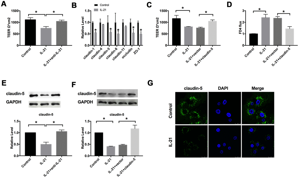 The damage of the colonic mucosal barrier function is one of the pathogenesis of UC. Occludin, claudin, and zonulae occludente (ZO) in colonic epithelial cells play an essential role in intestinal tight junction function. We detected the level of claudin-1, claudin-4, claudin-5, claudin-8, claudin-11, occludin, and ZO-1 by employing the RT-PCR assay. We observed that claudin-1, claudin-5, claudin-8, occludin, and ZO-1 were decreased after IL-21 treatment in cells (Figure 2B). Except for claudin-1 and claudin-8, claudin-5 is the most significantly abnormal expression in Caco-2 cells after IL-21 treatment. We speculated that claudin-5 might be downstream of IL-21 in UC. Then we constructed the plasmid for upregulating the level of claudin-5 (claudin-5), vector plasmid (vector) was described as a negative control, we transfected claudin-5/vector into Caco-2 cells after treated with or without IL-21, we observed that overexpression of claudin-5 restored the injured-intestinal epithelial barrier function after IL-21 treatment (Figure 2C). We also evaluated the permeability of Caco-2 monolayer with fluorescein isothiocyanate-dexamethasone (FD4). Similar to the results of TEER, the overexpression of claudin-5 restored the change of FD 4 level caused by IL-21 (Figure 2D). Meanwhile, we assessed the protein level of claudin-5 in Caco-2 cells after IL-21 and IL-21 neutralizing antibodies treatment. Western blot assay results showed that IL-21 inhibited the level of claudin-5, and IL-21 neutralizing antibodies recovered the level of claudin-5 (Figure 2E, 2F). Further, we detected the expression of claudin-5 after IL-21 administrated by immunofluorescence experiment, similar to western blot assay, IL-21 blocked the expression of claudin-5 (Figure 2G). In summary, IL-21 regulated the function of the intestinal barrier by controlling the level of claudin-5.
