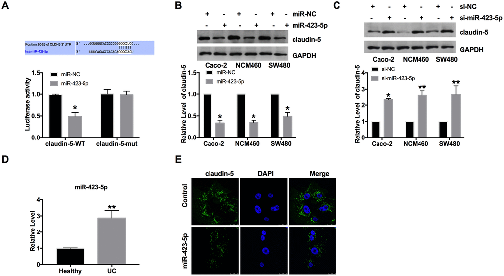 Through the prediction of the bioinformatics website, we found that there are binding sequences between miR-423-5p and claudin-5. By performing luciferase assay, we ensured that miR-423-5p could interact and bind with 3'UTR of claudin-5 (Figure 3A). Then we transfected the miR-423-5p mimic/miR-NC into three colorectal epithelial cells (Caco-2, NCM460, and SW480 cells). Then the protein level of claudin-5 was assessed in different cell lines. Figure 3B showed that forced expression of miR-423-5p could inhibit the level of claudin-5. Further, si-miR-423-5p/si-NC were transfected into cells for detecting the level of claudin-5. The assays performed, blocking the level of miR-423-5p would restore the level of claudin-5 (Figure 3C). Meanwhile, we found that the level of miR-423-5p was abnormally elevated in UC patients (Figure 3D). Further, we detected the level of claudin-5 in Caco-2 cells by immunofluorescence experiment, similar to western blot assay. MiR-423-5p blocked the expression of claudin-5 (Figure 3E).