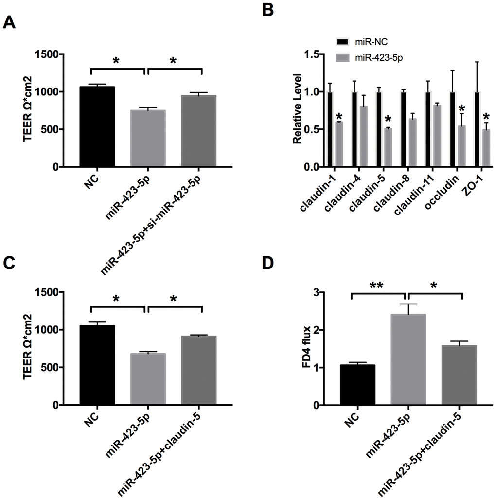 We found that miR-423-5p mimic transfection reduced the TEER of Caco-2 cells. However, si-miR-423-5p significantly enhanced the tight junction of Caco-2 cells (Figure 4A). Then we detected the level of claudin-1, claudin-4, claudin-5, claudin-8, claudin-11, occludin, and ZO-1. We observed that the mRNA level of claudin-5 was also decreased after miR-423-5p mimic transfection in cells (Figure 4B). We transfected claudin-5 into Caco-2 cells after transfecting with miR-423-5p mimic/miR-NC, we observed that overexpression of claudin-5 restored the injured-intestinal epithelial barrier function after forced expression of miR-423-5p (Figure 4C). Similar to the results of TEER, the overexpression of claudin-5 restored the change of FD4 level caused by overexpression miR-423-5p (Figure 4D). Taken together, miR-423-5p would control the intestinal epithelial barrier function by targeting claudin-5.