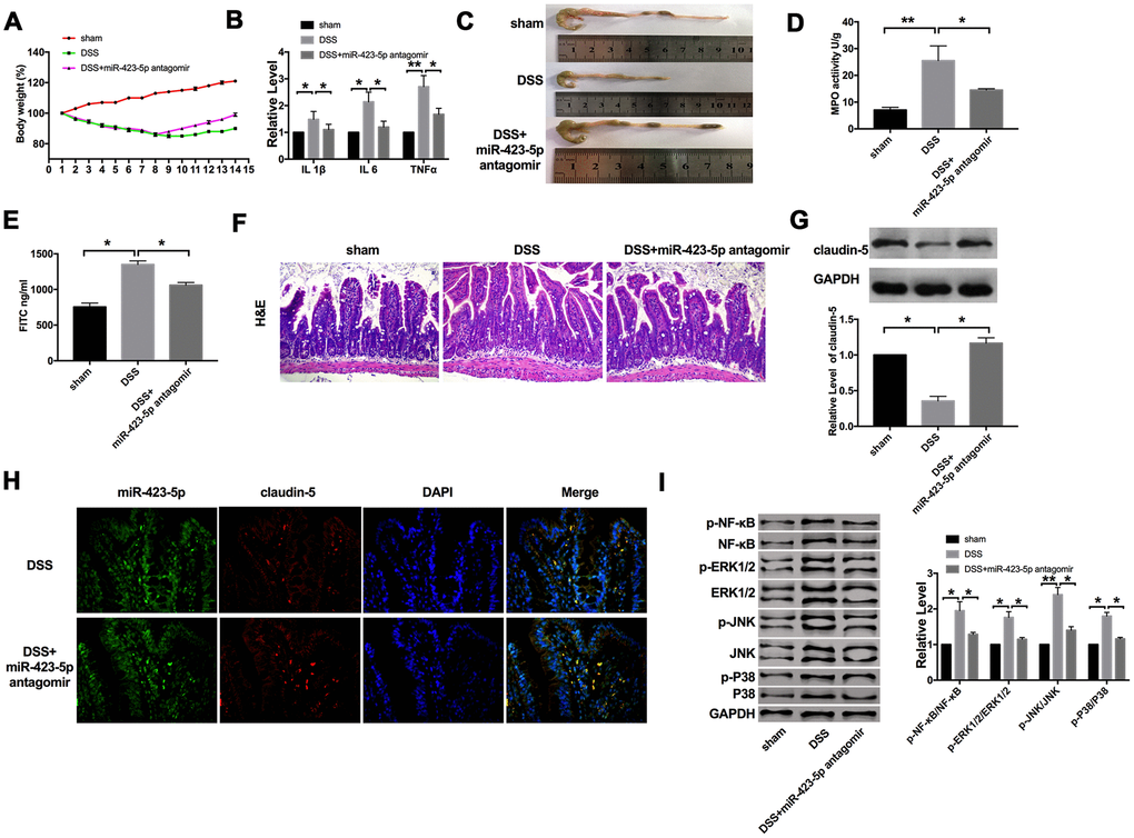 We also found that mice treated with miR-423-5p antagomir had a protective effect on experimental colitis compared with the DSS group (Figure 5C). Colonic MPO activity also showed that miR-423-5p antagomir could significantly reduce inflammation (Figure 5D). Further, miR-423-5p antagomir down-regulated the level of FD40 in the serum of DSS mice (Figure 5E). H&E staining also performed that miR-423-5p antagomir alleviated the inflammation level induced by DSS (Figure 5F). Meanwhile, we determined the level of claudin-5. MiR-423-5p antagomir restored the down-regulated of claudin-5 in DSS mice (Figure 5G). Consistent with the results of western blot, the immunofluorescence experiment was performed on rectal tissue sections, and it was found that the level of claudin-5 increased in DSS mice injected with miR-423-5p antagomir (Figure 5H). Meanwhile, we detected the components of the NF-κB/MAPKs/JNK signaling pathway. DSS-induced the phosphorylation of NF-κB, ERK1/2, JNK, and P38, which were inhibited by miR-423-5p antagomir (Figure 5I).