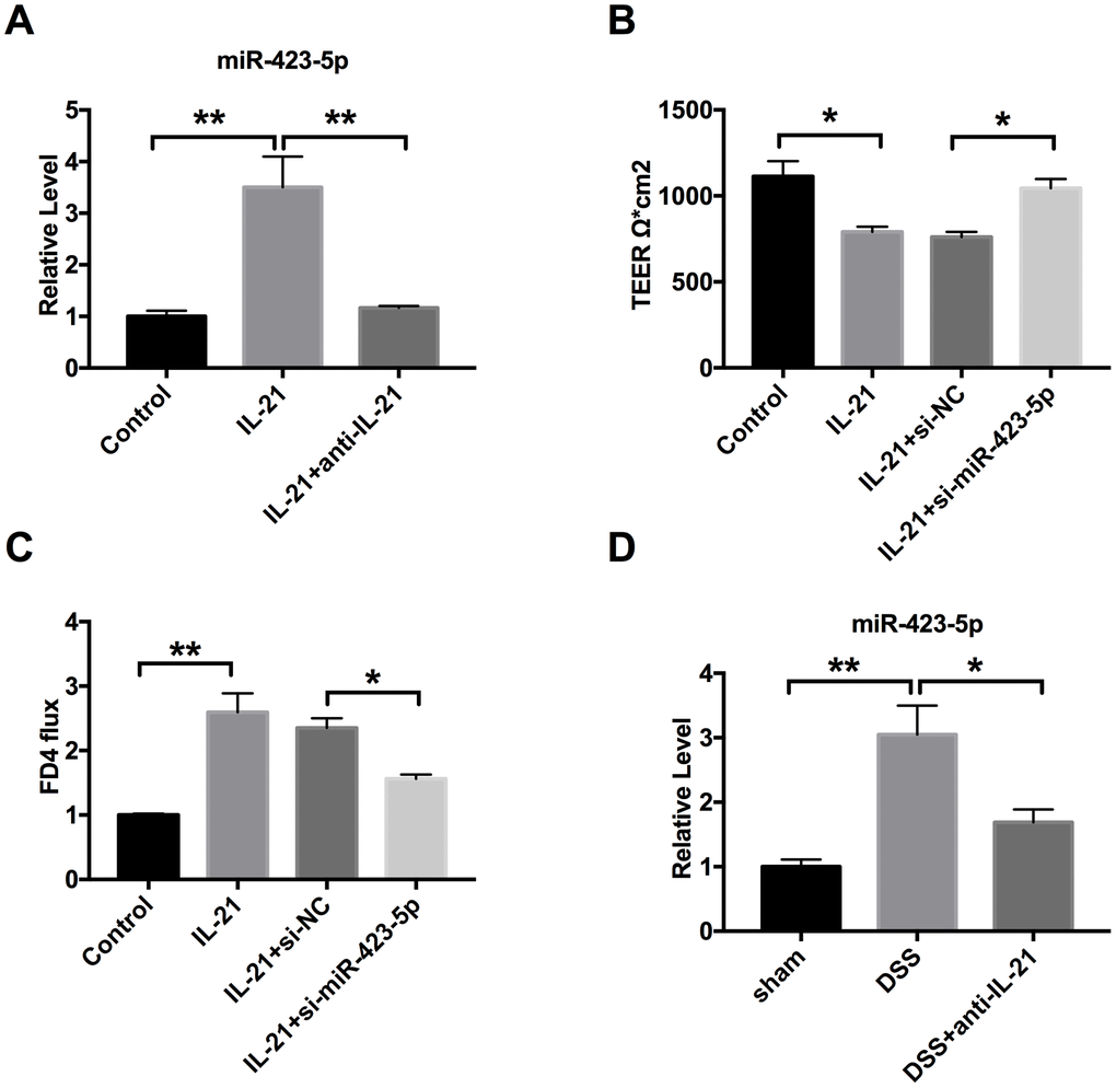 Based on the above experimental results, we confirmed that miR-423-5p participated in UC progression. Next, we need to confirm the relationship between IL-21 and miR-423-5p. Colorectal epithelial cells were treated with IL-21 and IL-21 neutralizing antibody, the level of miR-423-5p was assessed by RT-PCR. We observed that IL-21 induced expression of miR-423-5p, and IL-21 neutralizing antibody blocked the expression of miR-423-5p (Figure 6A). Then the Caco-2 cells were transfection with si-miR-423-5p/si-NC after IL-21 treatment. By TEER detecting, we observed that si-miR-423-5p restored the injured-intestinal epithelial barrier function after IL-21 treatment (Figure 6B). Down-regulated of miR-423-5p recovered the change of FD4 level caused by IL-21 (Figure 6C). In vivo, compared with DSS mice, the level of miR-423-5p was down-regulated in DSS mice after IL-21 neutralizing antibody injection (Figure 6D). Taken together, miR-423-5p may be downstream of IL-21 and regulated by IL-21