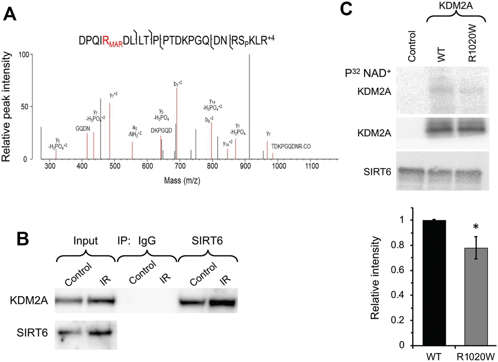 Figure 1. SIRT6 mono-ADP ribosylates KDM2A on R1019/R1020 (mouse/human). (A) Mass spec analysis of mouse KDM2A mono-ADP ribosylation. MS2 fragment spectrum of a KDM2A peptide obtained from mouse embryonic fibroblast cells supporting R1019 modified by a ribose-phosphate group indicating mono-ADP ribosylation (MAR). Pictured is an assignment showing ribose-phosphate modified R1019. A full compiled report downloaded from Protein Prospector of the MS2 data for this peptide can be found in the Supplementary Data (Supplementary Data 1). (B) SIRT6 interacts with KDM2A. coimmunoprecipitation of KDM2A was observed with antibodies directed against SIRT6 before and after irradiation (IR) (the experiment was repeated three times). (C) SIRT6 mono-ADP ribosylates KDM2A in vitro. KDM2A R1020W mutation significantly decreases SIRT6 mono-ADP ribosylation signal. Top panel. SIRT6 protein was incubated with purified human wild type flag-KDM2A or mutant R1020W proteins in the presence of radiolabeled NAD+. Mono-ADP ribosylation was detected by transfer of the radiolabel to the substrate. Lower panel. Quantification of upper gel. Graph represents mean ± SD of three experiments. *p > 0.05.