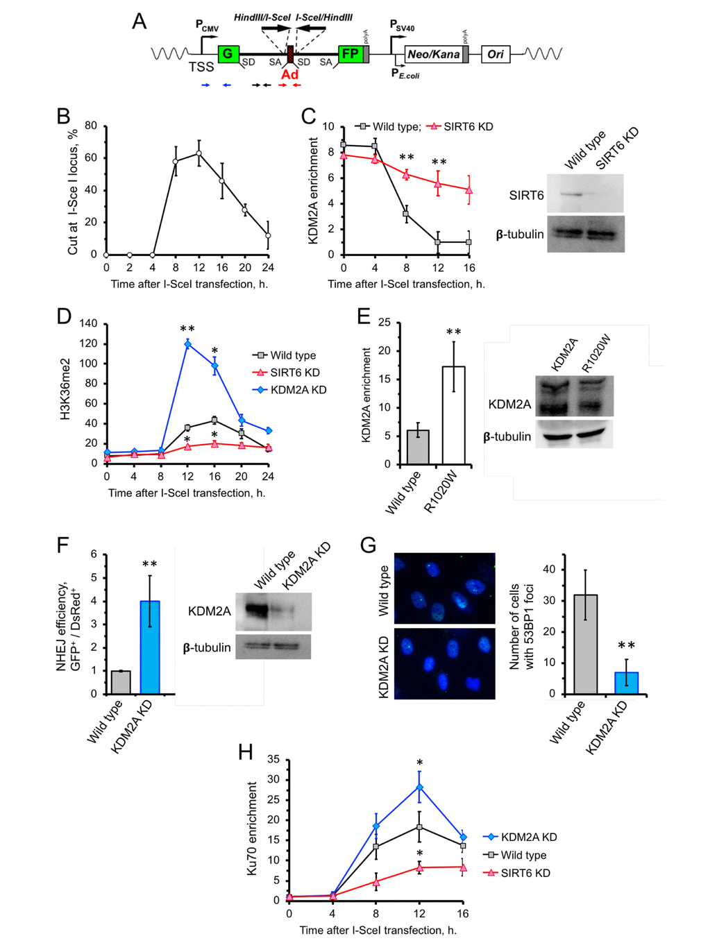 Figure 2. SIRT6 mediates KDM2A displacement from chromatin to enhance NHEJ. (A) Schematic representation of the GFP-based NHEJ reporter, which represents an RNA Pol II-transcribed gene. DSBs are introduced by transient expression of I-SceI enzyme. The positions of the primer used in this study are indicated by small arrows below: primers for quantification of the preRNA (small black arrows); quantification of DNA DSBs (small red arrows), chromatin IP (blue arrows). (B) Quantification of the cutting efficiency at different time points after transfection with I-SceI vector. DSBs were quantified as a ratio between the product obtained with primers amplifying across the break (red arrows) to a PCR product from a gene away from DSB site (Supplementary Figure 2). The experiment was repeated three times. (C) KDM2A dissociation from broken chromatin is SIRT6-dependent. Time-course chromatin-IP was performed using antibody against endogenous KDM2A in human skin fibroblasts harboring chromosomally-integrated NHEJ GFP reporter with I-SceI sites. Western blot shows depletion of SIRT6. (D) H3K36me2 accumulation post DSB induction is SIRT6-dependent. ChIP analysis of H3K36me2, at different time points post transfection with I-SceI vector using antibody specific for H3K36me2. qPCR was performed using primers positioned 50 bp downstream of TSS. (E) Non-ribosylatable KDM2A R1020W mutant bids to DSBs more efficiently than the wild type protein. Human skin fibroblasts carrying I-SceI reporter cassette were transfected with wild type or mutant (R1020W) KDM2A and I-SceI encoding vectors. At 12 hours post transfection cells were harvested followed by ChIP-qPCR with antibodies against FLAG. Western blot showing the levels of wild type and mutant FLAG-KDM2A proteins in cells after transfection. (F) Cells depleted of KDM2A have enhanced NHEJ repair efficiency. Cells were treated with siRNA to KDM2A four days before transfection with I-SceI. NHEJ efficiency was measured by reactivation of the GFP reporter normalized to transfection efficiency (DsRed) 48 h after I-SceI transfection. Western blot shows KDM2A depletion. (G) Downregulation of KDM2A reduces the number of 53BP1 foci. KDM2A knocked down cells were grown to confluency and fixed for IF experiment using antibody against 53BP1. On the right; quantification of the IF image obtained from 100 nuclei. All experiments were repeated at least three times. (H) Ku70 recruitment to DSB site requires SIRT6, and is counteracted by KDM2A. Time course of ChIP experiment using antibody against Ku70. The experiment was repeated three times. *p < 0.05; **p <0.01.