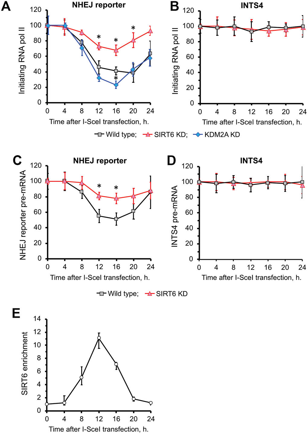 Figure 3. SIRT6 is required for inhibition of transcription upon induction of DNA DSB. (A) SIRT6 is required for RNA Pol II displacement upon DSB. Time course ChIP analysis of initiating (S5 phosphorylated) RNA Pol II levels on the TSS region of the GFP in NHEJ reporter upon DSB induction. (B) Time course ChIP analysis of initiating RNA Pol II levels on the TSS region of INTS4 gene, which does not undergo a DSB (negative control to A). (C) qRT-PCR analysis of GFP premature RNA expression at different time points after transfection with I-SceI vector. (D) qRT-PCR analysis of INTS4 premature RNA expression (control for C). (E) SIRT6 recruitment to DSB peaks within 12 h post DSB induction. Chromatin IP of endogenous SIRT6 in skin fibroblasts. Chromatin samples were analyzed by qPCR using primers flanking I-SceI cut sites with antibodies against SIRT6 or IgG. The positions of primers in NHEJ reporter and INTS4 gene are shown in Figures 2A and Supplementary Figure 2. The experiments were repeated three times. *p < 0.05.