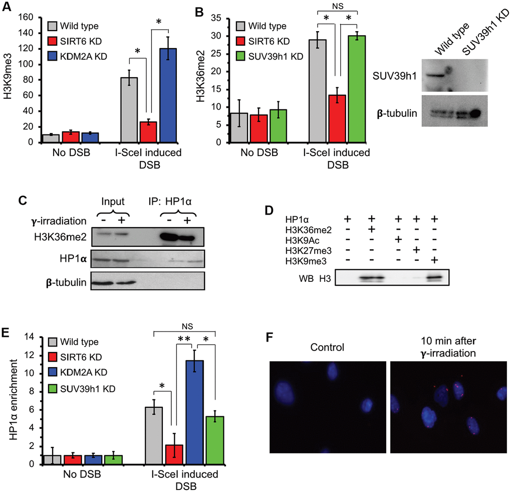 Figure 4. H3K36me2 recruits HP1α and promotes deposition of H3K9me3 at DSB locus in SIRT6-dependent manner. (A) SIRT6, but not KDM2A, is required for deposition of H3K9me3 at DSB locus. ChIP assay was performed 12 h post transfection with I-SceI vector using antibody against H3K9me3. (B) SIRT6, but not SUV39h1, is required for accumulation of H3K36me2 at DSB locus. Western blot shows depletion of SUV39h1. (C) HP1α binds H3K36me2 in vivo. Human skin fibroblast cells were irradiated with 3 Gy of γ-irradiation. Cell lysate was immunoprecipitated within 10 minutes after irradiation with antibody against HP1α and blotted against H3K36me2 (Top panel), HP1α (middle) and β-tubulin (lower panel). (D) HP1α binds H3K36me2 in vitro. Mono nucleosomes carrying either H3K36me2, H3K27me3, H3K9me3 or H3K9Ac groups were incubated with HP1α and immunoprecipitated with antibody against HP1α and blotted with H3 antibodies. (E) SIRT6, but not SUV39h1, is required for HP1α recruitment to DSB locus. (F) HP1α interacts with 53BP1 after γ-irradiation. Proximity ligation assay (PLA) was performed using antibodies against HP1α and 53BP1 and the PLA signal was detected within 10 minutes after irradiation. NS; not significant. All experiments were repeated three times. *p < 0.05; **p <0.01.