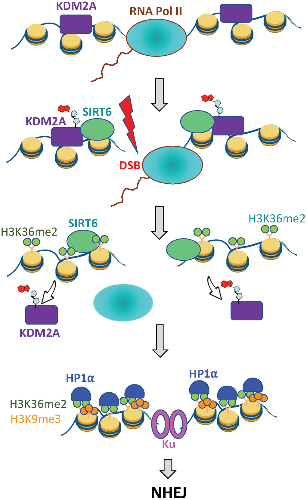 Figure 5. SIRT6 prevents collision between transcription and DSB repair machineries. Under basal conditions KDM2A demethylates H3K36 at transcription start site. Upon DNA damage SIRT6, is recruited to the DSB locus and mono-ADP ribosylates KDM2A leading to its displacement from chromatin. This leads to accumulation of H3K36me2 marks around the DSB site, which recruits HP1α and promotes deposition of H3K9me3 mark leading to local chromatin compaction. As a result, transcription is paused and DNA repair by NHEJ ensues.