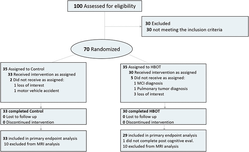Based on previous studies on cognitive improvements following HBOT, assuming a five-point improvement in the global cognitive score in NeuroTrax following HBOT, compared to two points in the control group, with a four point standard deviation of the change, with a power of 80% and an alpha of 5%, 29 participants would be required in each arm. Adding a 15% dropout rate would require 70 patients in total.