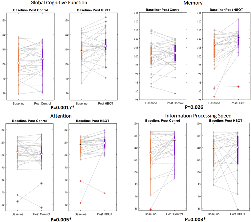 To evaluate HBOT’s effects on cognitive scores, a within-subject repeated measures ANOVA model was used to test the main interaction effect between time and group. The false discovery rate (FDR) method was used for multiple comparisons correction. In addition, covariate-adjusted effects were examined, with covariates of age, sex and years of education.